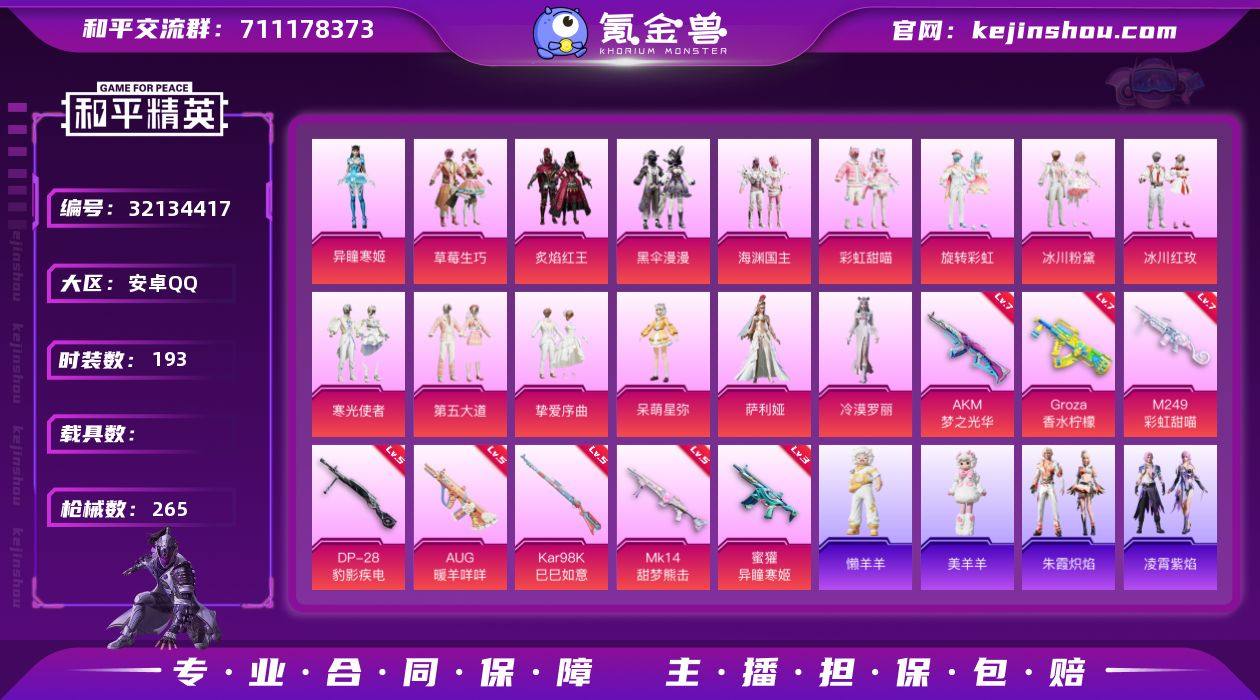 YZJ14288-可二次-安卓Q-2稀有15粉装8特效枪18热门【精品女号 多种优质粉裙 第五大道 呆萌 草莓生巧 旋转彩虹 彩虹甜喵 晶辉守护 小狗蛇点点 银碳小老虎 大橘为重 情公主 萌趣绒叽 美羊羊 鲨鱼裤 满级AK梦之光华 满级狗砸香水柠檬 满级大菠萝彩虹甜喵 百万伏特猫包】193套装265枪皮 90890热力值 17印记 历史超级王牌10星 【2稀有】 AKM-缤纷海域 SCAR-L-粉色回忆 【15粉装】 萨利娅 异瞳寒姬 冷漠罗丽 呆萌星弥 挚爱序曲 第五大道 草莓生巧 炙焰红王 彩虹甜喵 冰川粉黛 冰川红玫 旋转彩虹 寒光使者 黑伞漫漫 海渊国主 【8特效枪】 Kar98K-巳巳如意 (5级) DP-28-豹影疾电 (5级) AUG-暖羊咩咩 (5级) 蜜獾-异瞳寒姬 (3级) Mk14-甜梦熊击 (5级) GROZA-香水柠檬 (7级) AKM-梦之光华 (7级) M249-彩虹甜喵 (7级) 【18热门】 龟仙人 浪漫假日 晶辉守护 小狗蛇点点 银碳小老虎 迅捷狂鲨 大橘为重 暗夜契约 团圆交子 瑞龙福将 纯白誓言 粉红小猪 豚鼠丹丹 韶华初心 破蛋小黄鸡 弄潮海豚 M762-瑞龙福将 GROZA-林间仙鹿 【3飞行器】炫彩糖果飞行器 招财竹蜻蜓飞行器 异域银装飞行器 【4头盔】 百万伏特头盔 深海小丑鱼头盔 甜蜜誓约头盔 夏日绵绵冰头盔 【5背包】 百万伏特背包 深海小丑鱼背包 深海曼妙背包 甜蜜誓约背包 夏日绵绵冰背包 营地ID:786819353