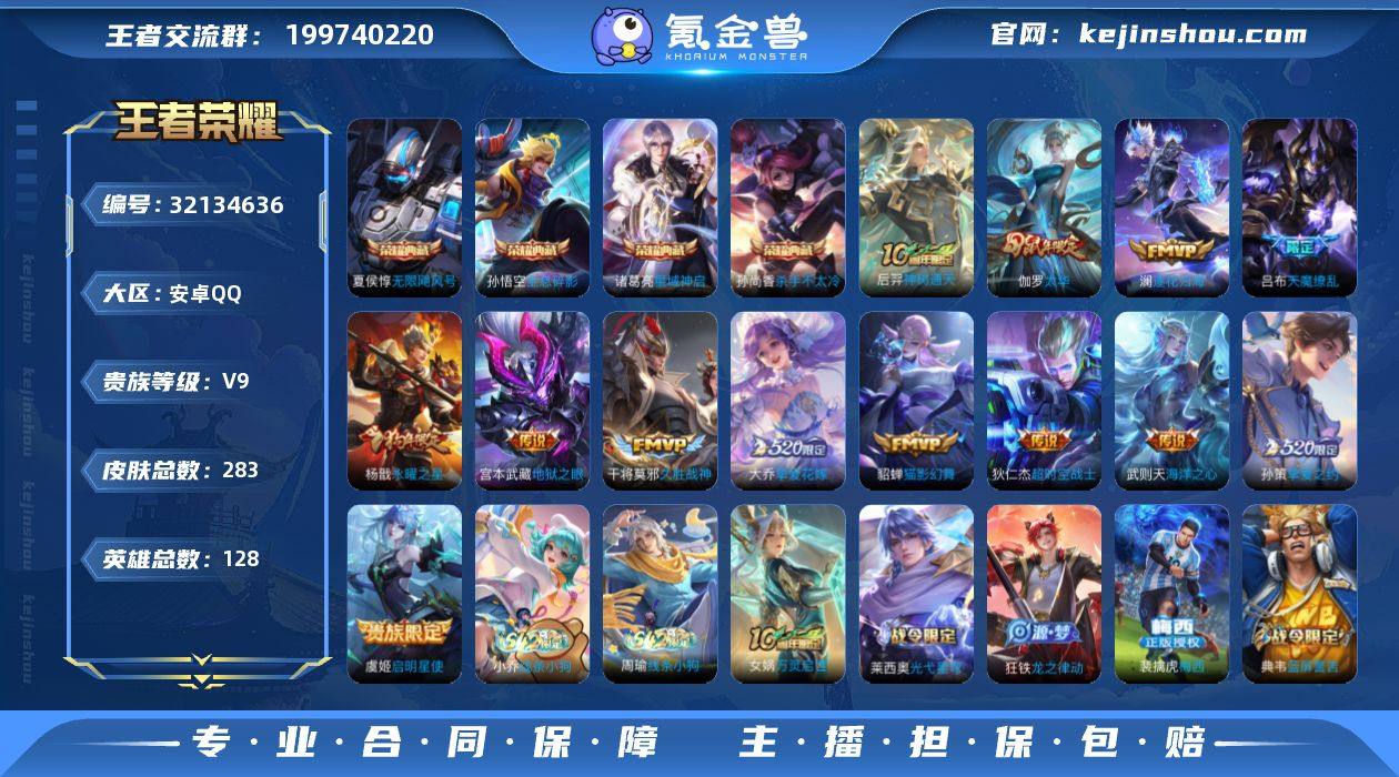实名: 可修改 性别: 女号 贵族等级: V9 英雄数: 128 皮肤数: 283 荣耀水晶: 无限飓风号,杀手不太冷,全息碎影,星域神启 传说皮: 猫影幻舞,久胜战神,海洋之心,地狱之眼,超时空战士-狄仁杰,挚爱之约,挚爱花嫁,澜逐花归海,神树通天 限定皮: 冰锋战神,遇见飞天,云端筑梦师,龙胆,烈魂,辉光之辰,玄嵩,岱宗,天魔缭乱,蜜橘之夏,永曜之星,幽恒,时之彼端,飞衡,太华,天狼征服者,冰霜恋舞曲,逐梦之影,青龙志,梅西,如梦令-嫦娥,如梦令-后羿,大圣娶亲,霸王别姬-项羽,霸王别姬-虞姬,高山流水,百木心枪 亮点: 【优质装备】:无限飓风号(高达),杀手不太冷,全息碎影(猴子典藏),星域神启(倪克斯贼亮),猫影幻舞,久胜战神,海洋之心,地狱之眼,超时空战士-狄仁杰,挚爱之约,挚爱花嫁,澜逐花归海