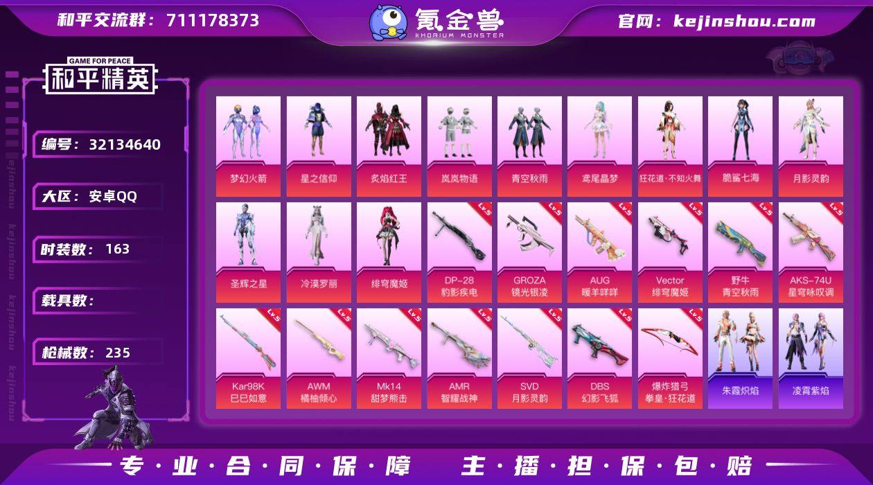 YZJ15122-可二次-安卓Q-12粉装15特效枪7热门【精品女号 火箭少女 不知火舞 绯穹魔姬 鸢尾晶梦 岚岚物语 粉雾星云 时希公主 李逍遥 樱桃黑巧 8款飞行器 3张改名卡】163套装235枪皮 75007热力值 3印记 历史超级王牌3星 【12粉装】 梦幻火箭 狂花道·不知火舞 绯穹魔姬 月影灵韵 脆鲨七海 冷漠罗丽 圣辉之星 星之信仰 青空秋雨 鸢尾晶梦 炙焰红王 岚岚物语 【15特效枪】 AKS-74U-星穹咏叹调 (5级) Kar98K-巳巳如意 (5级) AWM-橘柚倾心 (5级) Vector-绯穹魔姬 (5级) DP-28-豹影疾电 (5级) SVD-月影灵韵 (5级) AUG-暖羊咩咩 (5级) Mk14-甜梦熊击 (5级) AMR-智耀战神 (5级) GROZA-镜光银凌 (5级) DBS-幻影飞狐 (5级) 野牛-青空秋雨 (5级) Mk14-福马献瑞 (5级) AA12-G-萌骑幻想 (5级) 爆炸猎弓-拳皇·狂花道 (5级) 【7热门】 龟仙人 鹰眼刺客 暗夜契约 粉红小猪 漫步者 破蛋小黄鸡 军刀雅典娜 【2飞行器】 梦幻火箭飞行器 千面幻镜飞行器 【1背包】 梦幻火箭背包 营地ID:750414289