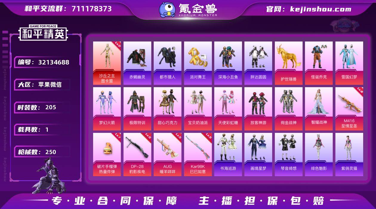 YZJ14809-可二次-苹果V-1红装5稀有1载具10粉装5特效枪23热门【精氪男神素材号 神装 身法 多种热门套装 JDG粉丝logo 2级神装图卡盟 8级至情至圣 小丑 雪国 火箭少女 巧克力三姐妹 都市 赤蝎 金鞋 发光眼罩 极限特训 绚金战神 冷酷挑战者 蓝螳螂 小丑鱼 青涩年华 激萌罗小黑 胖达圆圆 JDE战队服 憨乐熊二 绒宝小鹅 双马尾 红眼罩 狂沙 天命 甜心宝贝头盔背包 幻影战神背包 2个升级飞行器 13款飞行器 粉雪蛇宝-伙伴】205套装250枪皮 81222热力值 18印记 历史绝世王牌17星 【1红装】 沙丘之主-图卡盟 (2级) 【5稀有】 赤蝎幽灵 都市猎人 浪漫天命 派对舞王 派对舞王(金靴子) 【1载具】 护世瑞兽 【10粉装】 梦幻火箭 雪国幻梦 宝贝奶油派 天使彩虹糖 甜心巧克力 怪诞乔克 智耀战神 放客神游 极限特训 绚金战神 【5特效枪】 Kar98K-巳巳如意 (5级) DP-28-豹影疾电 (5级) AUG-暖羊咩咩 (5级) M416-至情至圣 (8级) 破片手榴弹-热量炸弹 (7级) 【23热门】 Mark.06 小丑鱼 龟仙人 青涩年华 雪山精英 呆萌铁蟹 鹰眼刺客 激萌罗小黑 深海小丑鱼 胖达圆圆 JDE战队服 暗影哥特 醒狮腾龙 团圆交子 瑞龙福将 粉红小猪 水银刺客 狂沙舞者 漫步者 破蛋小黄鸡 极速红龙 弄潮海豚 M762-瑞龙福将 【3飞行器】 龙翔九天飞行器 梦幻火箭飞行器 齐天大圣飞行器 【3头盔】 雪国精灵头盔 甜心宝贝头盔 深海小丑鱼头盔 【5背包】 梦幻火箭背包 雪国精灵背包 甜心宝贝背包 幻影战神背包 深海小丑鱼背包 营地ID:775259692