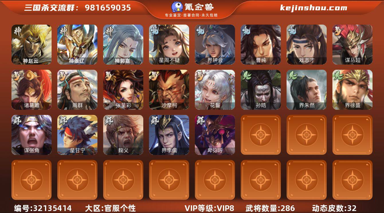【289】官阶:骠骑将军;VIP等级:VIP8;史诗武将数量:23;动态皮肤数量:32;武将总数:286;史诗宝珠数量:26;将魂数量:0;神将:4;魏国史诗武将:18;蜀国史诗武将:6;吴国史诗武将:3;群史诗武将:6 神赵云,神张辽,神郭嘉,神周瑜,星周不疑,界钟会,曹纯,戏志才,谋马超,诸葛瞻,周群,张星彩,沙摩柯,花鬘,孙皓,界朱然,界徐盛,星甘宁,麹义,界李儒,卑弥呼,谋张角,阎象,神郭嘉-虎年清明(动态),郭嘉-以身证道(动态),星周不疑-才广志宏(动态),钟会-潜蛟觊天(动态),曹丕-气荡山河(动态),甄姬-明珠耀躯(动态),许褚-兔年端午(动态),荀彧-驱虎吞狼(动态),曹纯-虎年春节(动态),羊徽瑜-牛年中秋(动态),费祎-安民护祚(动态),周处-义除三害(动态),周瑜-运筹帷幄(动态),孙权-永开吴祚(动态),孙策-虎踞江东(动态),孙权-牛年七夕(动态),界孙权-牛年七夕(动态),凌统-长风破浪(动态),界凌统-长风破浪(动态),袁绍-一往无前(动态),李儒-鸠杀少帝(动态),界李儒-鸠杀少帝(动态),张鲁-虎年冬至(动态)