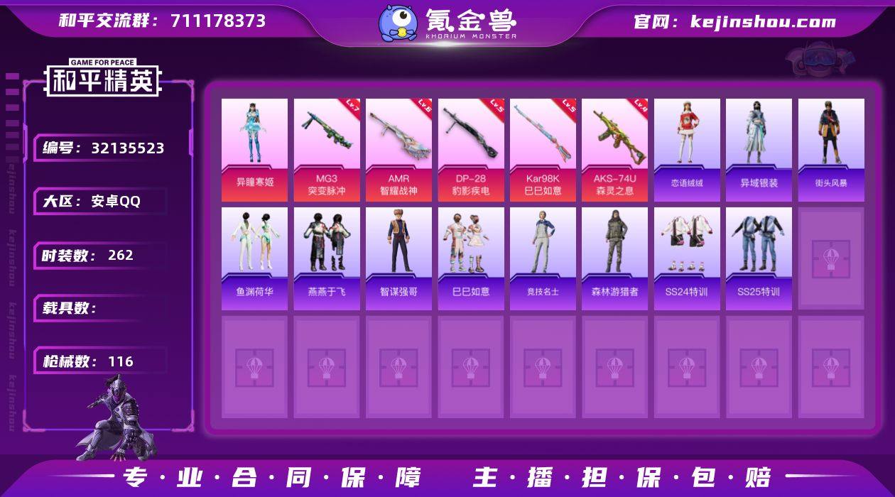 【特价出售】钱包不能注销安卓Q-1粉装5特效枪4热门62套装116枪皮 30177热力值 1印记 历史超级王牌 【1粉装】 异瞳寒姬 【5特效枪】 AKS-74U-森灵之息 (4级) Kar98K-巳巳如意 (5级) MG3-突变脉冲 (7级) DP-28-豹影疾电 (5级) AMR-智耀战神 (6级) 【4热门】 龟仙人 豚鼠丹丹 破蛋小黄鸡 极速红龙