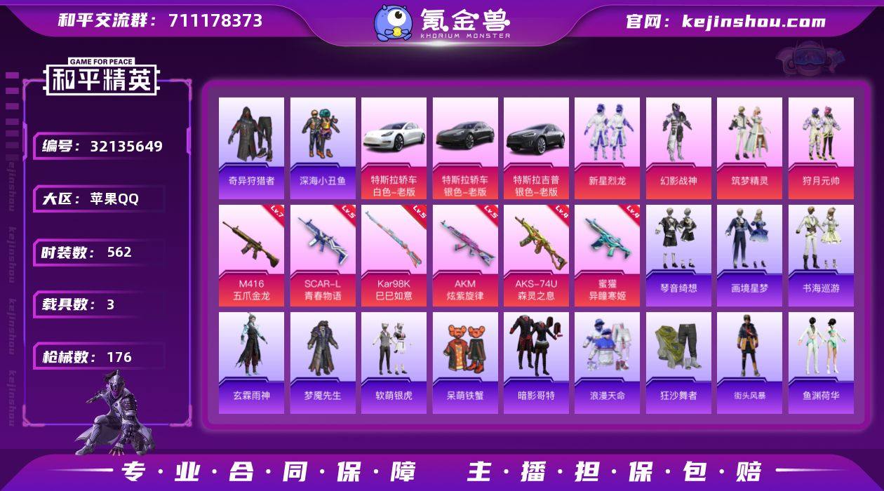 【特价出售】钱包不可注销苹果Q-2稀有3载具4粉装6特效枪22热门147套装176枪皮 58222热力值 6印记 历史超级王牌6星 【2稀有】 奇异狩猎者 浪漫天命 【3载具】 特斯拉3白色 特斯拉3银色 特斯拉X银色 【4粉装】 幻影战神 筑梦精灵 狩月元帅 新星烈龙 【6特效枪】 M416-五爪金龙 (7级) AKM-炫紫旋律 (5级) AKS-74U-森灵之息 (4级) Kar98K-巳巳如意 (5级) 蜜獾-异瞳寒姬 (4级) SCAR-L-青春物语 (5级) 【22热门】 龟仙人 青涩年华 梦魇先生 呆萌铁蟹 软萌银虎 深海小丑鱼 NV战队服 暗影哥特 团圆交子 瑞龙福将 狂沙舞者 抹茶蜜豆 朱雀圣者 娴静芝兰 机械英豪 破蛋小黄鸡 风华少年志 白月香洋装 极速红龙 弄潮海豚 M762-瑞龙福将 M24-奇异狩猎者 【1飞行器】 星夜魔法师飞行翼 【2头盔】 幻影战神头盔 马卡龙头盔 【2背包】 神秘黑猫背包 夏日绵绵冰背包
