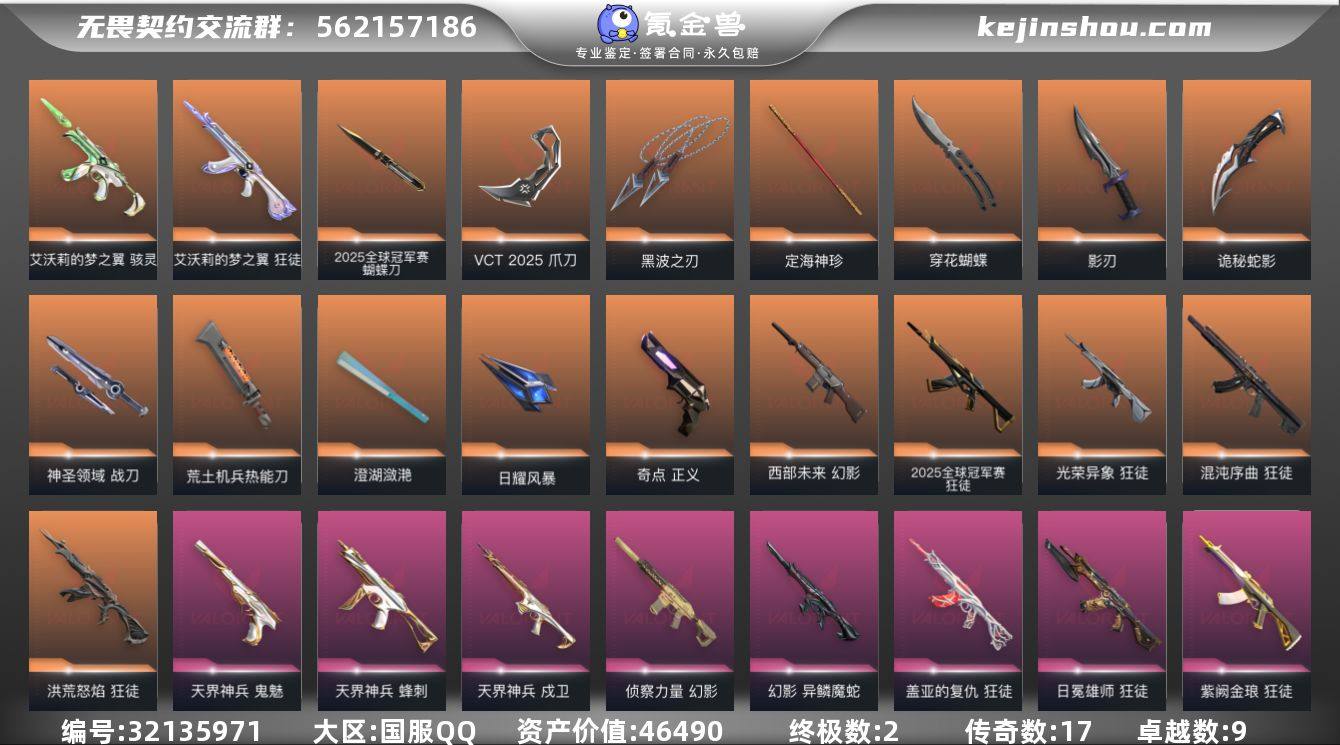 段位: 超凡 套装: VCTCN2025套装,VCT 2025赛季礼包,2025全球冠军赛 近战武器皮肤: 澄湖潋滟,定海神珍-盖世英雄,黑波之刃-塑水宗,影刃-掠影,荒土机兵热能刀,穿花蝴蝶-黑市,神圣领域 战刀,VCT 2025 爪刀,诡秘蛇影,日耀风暴,2025全球冠军赛 蝴蝶刀 步枪皮肤: 狂徒-紫阙金琅,狂徒-盖亚的复仇,幻影-侦察力量,戍卫-天界神兵,狂徒-洪荒怒焰,狂徒-日冕雄师,狂徒-艾沃莉的梦之翼,狂徒-混沌序曲,幻影-异鳞魔蛇,幻影-西部未来,狂徒-光荣异象,2025全球冠军赛 狂徒 佩枪皮肤: 正义-奇点,鬼魅-天界神兵 狙击枪皮肤: 冥驹-堕天遗武 冲锋枪皮肤: 蜂刺-天界神兵,骇灵-艾沃莉的梦之翼 亮点: 【优质装备】:2025全球冠军赛,2025全球冠军赛 蝴蝶刀,正义-奇点,狂徒-艾沃莉的梦之翼,狂徒-混沌序曲,狂徒-紫阙金琅,狂徒-盖亚的复仇,幻影-侦察力量,冥驹-堕天遗武,狂徒-洪荒怒焰,狂徒-日冕雄师,骇灵-艾沃莉的梦之翼,澄湖潋滟,鬼魅-天界神兵,戍卫-天界神兵,定海神珍,黑波之刃,影刃,荒土机兵热能刀,穿花蝴蝶,神圣领域 战刀,VCT 2025 爪刀,诡秘蛇影,日耀风暴 遗器,2025全球冠军赛 狂徒