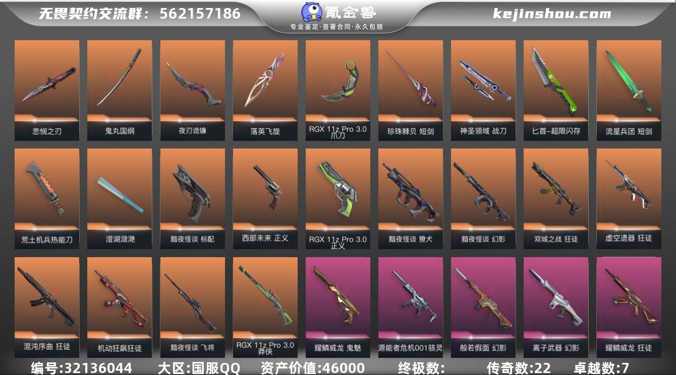 段位: 黄金 亮点皮肤: 悲悯之刃 套装: RGX 11z Pro//3.0套装,黯夜怪谈套装 近战武器皮肤: 澄湖潋滟,短剑-珍珠棘贝,落英飞旋-千灵华绽,军刀-流星军团错误,爪刀-RGX 11z Pro 3.0,短剑-流星兵团,夜刃诡镰-黯夜怪谈,匕首-超限闪存,荒土机兵热能刀,鬼丸国纲-般若假面//2.0,神圣领域 战刀,无畏契约季前邀请赛 悲悯之刃 步枪皮肤: 狂徒-机动狂飙,狂徒-耀鳞威龙,幻影-般若假面,幻影-离子武器,狂徒-混沌序曲,獠犬-黯夜怪谈,幻影-黯夜怪谈,狂徒-掠影,狂徒-双城之战,狂徒-虚空遗器 佩枪皮肤: 鬼魅-耀鳞威龙,正义-RGX 11z Pro 3.0,标配-黯夜怪谈,正义-西部未来 狙击枪皮肤: 莽侠-RGX 11z Pro 3.0,飞将-黯夜怪谈,冥驹-掠影 冲锋枪皮肤: 骇灵-源能者危机001 亮点: 【优质装备】:悲悯之刃,黯夜怪谈套装,RGX 11z Pro//3.0套装,狂徒-混沌序曲,狂徒-掠影,狂徒-机动狂飙,幻影-般若假面,幻影-离子武器,正义-RGX 11z Pro 3.0,幻影-黯夜怪谈,冥驹-掠影,澄湖潋滟,狂徒-耀鳞威龙,落英飞旋,爪刀-RGX 11z Pro 3.0,夜刃诡镰,匕首-超限闪存,荒土机兵热能刀,鬼丸国纲,神圣领域 战刀,骇灵-源能者危机001,鬼魅-耀鳞威龙
