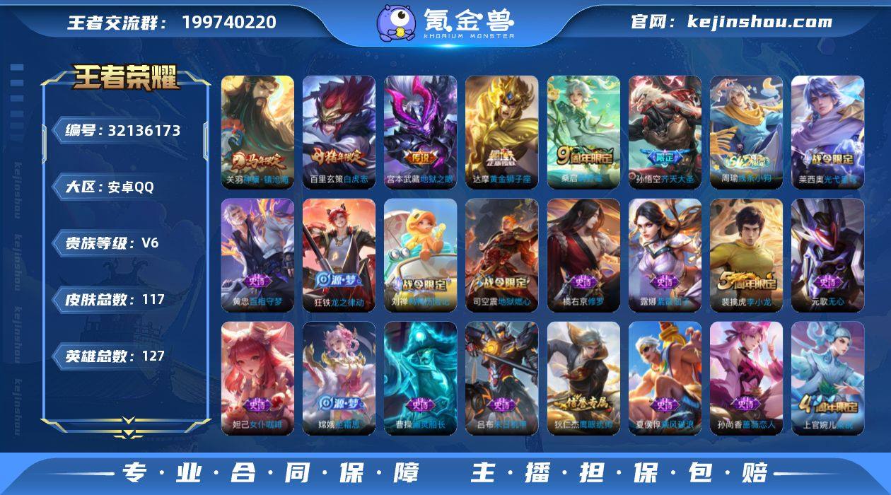 贵族等级:V6 典藏皮肤数:0 珍品无双皮肤数:0 无双皮肤数:0 珍品传说皮肤数:0 传说皮肤数:6 史诗皮肤数:33 皮肤数:117 英雄数:127 段位:王者