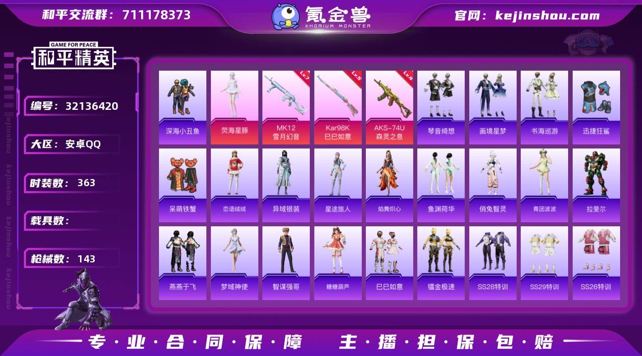 【ky204】安卓 手Q-0粉装-6特效枪-0载具-2粉色飞行器-32338热力值-4王牌印记-83套装-111枪皮 【热门品类】:套装-浪漫天命 【粉色枪皮等级】:GROZA-镜光银凌(五级),AUG-暖羊咩咩(五级),汤姆逊-热量炸弹(五级),AKS-74U-森灵之息(五级),Kar98K-巳巳如意(五级),Mk14-甜梦熊击(五级) 【粉色枪皮】:GROZA-镜光银凌,AUG-暖羊咩咩,汤姆逊-热量炸弹,AKS-74U-森灵之息,Kar98K-巳巳如意,Mk14-甜梦熊击 【粉色飞行器】:四圣焕新飞行器,月下星之子飞行器 【粉色降落伞】:四圣焕新降落伞,马卡龙降落伞,彩虹独角兽降落伞,月下星之子降落伞,樱桃泡泡降落伞,荧海星豚降落伞,炫彩糖果降落伞 【稀有套装】:套装-燕燕于飞,套装-鱼渊荷华,套装-云朵鹅,套装-雪绒豹,角色-灵公主,角色-霜刃之御 【稀有枪皮】:AKM-四圣焕新,AKM-夜灯,AKM-破晓战魂,AKM-霓虹街区,M16A4-红色方程式,SCAR-L-炫彩节奏,SCAR-L-红色方程式,M416-夜灯,M416-红色方程式,M416-蓝色火焰,GROZA-生命誓言,GROZA-马卡龙,GROZA-黑色刀锋,AUG-耀粉歌者,QBZ-原初圣火,QBZ-彩虹符号,M762-牛气冲天,M762-诡娃娃,M762-云朵鹅,AC-VAL-天降萌叽,UZI-众神之王,UZI-啾咪啾咪,UZI-天降萌叽,UZI-红色方程式,UMP45-生命誓言,UMP45-绒宝小鹅,Vector-彩虹符号,Vector-生命誓言,Vector-黑色刀锋,汤姆逊-勇闯险境,汤姆逊-天降萌叽,汤姆逊-耀粉歌者,MP5K-繁花小夜曲,Kar98K-勇闯险境,Kar98K-彩虹符号,SKS-勇闯险境,SKS-夜灯,SKS-炫彩节奏,VSS-黑色刀锋,Mini14-原初圣火,Mini14-炫彩节奏,Mini14-生命誓言,Mini14-金鼠迎春,SLR-四圣焕新,MK20-H-樱桃泡泡,SVD-云朵鹅,SVD-冷漠罗丽,S686-生命誓言,S1897-勇闯险境,S1897-荧海星豚,S12K-破晓战魂,S12K-夜灯,SPAS-12-云朵鹅,M249-四圣焕新,DP-28-原初圣火,D...