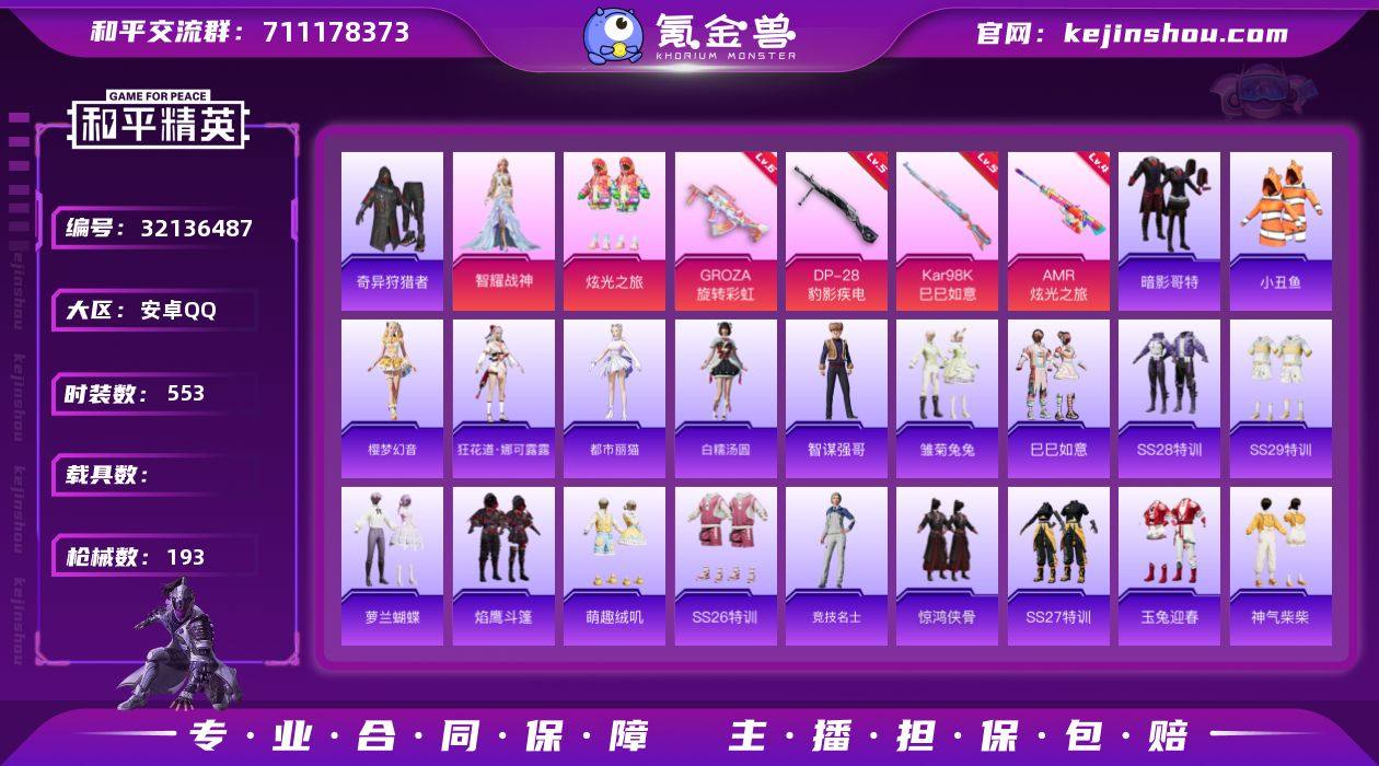 【特价出售】QQ钱包无法注销安卓Q-1稀有2粉装6特效枪8热门143套装193枪皮 58137热力值 5印记 历史超级王牌1星 【1稀有】 奇异狩猎者 【2粉装】 炫光之旅 智耀战神 【6特效枪】 Kar98K-巳巳如意 (5级) DP-28-豹影疾电 (5级) AMR-炫光之旅 (4级) GROZA-旋转彩虹 (6级) Mk14-福马献瑞 (5级) UMP45-萌骑冒险 (2级) 【8热门】 小丑鱼 龟仙人 暗影哥特 粉红小猪 破蛋小黄鸡 极速红龙 英勇保护者 M762-奇异狩猎者 【2头盔】 梦幻火箭头盔 深海小丑鱼头盔 【1背包】 梦幻火箭背包