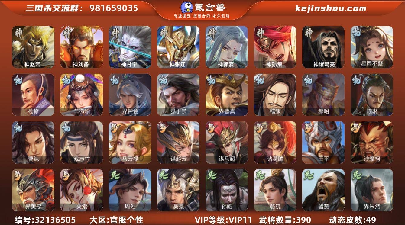 【475】官阶:大将军;VIP等级:VIP11;史诗武将数量:49;动态皮肤数量:49;武将总数:390;史诗宝珠数量:24;将魂数量:3526;神将:9;魏国史诗武将:15;蜀国史诗武将:8;吴国史诗武将:9;群史诗武将:14 神赵云,神刘备,神甘宁,神张辽,神郭嘉,神孙策,神吕蒙,神周瑜,神诸葛亮,星周不疑,杨修,羊徽瑜,界钟会,界于禁,界曹真,嵇康,郝昭,陈琳,曹纯,戏志才,关索,马云騄,谋赵云,谋马超,诸葛瞻,王平,沙摩柯,界黄忠,周处,吴景,孙皓,骆统,留赞,界朱然,界徐盛,界步练师,贺齐,郑玄,张让,星黄忠,陶谦,苏飞,司马徽,南华老仙,界左慈,界李儒,公孙康,杜预,张绣,李傕,许攸,神郭嘉-虎年清明(动态),神甘宁-万人辟易(动态),神诸葛亮-风舞魔鸟(动态),神周瑜-焰腾麒麟(动态),SP蔡文姬-兔年冬日(动态),张郃-背水一战(动态),钟会-谋谟之勋(动态),曹真-虎年春节(动态),界钟会-谋谟之勋(动态),朱灵-以战破氐(动态),王元姬-鼠年冬至(动态),羊徽瑜-牛年中秋(动态),关羽-啸风从龙(动态),关羽-明良千古(动态),马超-牛年春节(动态),黄月英-鼠年春节(动态),诸葛亮-虎年中秋(动态),刘禅-猪年端午(动态),界关羽-啸风从龙(动态),界马超-牛年春节(动态),界黄月英-鼠年春节(动态),界刘禅-猪年端午(动态),关银屏-鼠年中秋(动态),马云騄-牛年春节(动态),张星彩-虎年端午(动态),胡金定-明良千古(动态),周处-义除三害(动态),孙尚香-星流霆击(动态),大乔-鼠年春分(动态),小乔-鼠年春分(动态),界大乔-鼠年春分(动态),界孙尚香-星流霆击(动态),界小乔-鼠年春分(动态),徐盛-破军杀将(动态),孙鲁班-牛年端午(动态),界孙鲁班-牛年端午(动态),孙茹-烟水悠悠(动态),刘赞-灵魂歌王(动态),貂蝉-绝世倾城(动态),吕布-虓虎之勇(动态),左慈-役使鬼神(动态),许攸-盛气凌人(动态),界吕布-虓虎之勇(动态),界貂蝉-绝世倾城(动态),兀突骨-鼠年春节(动态)