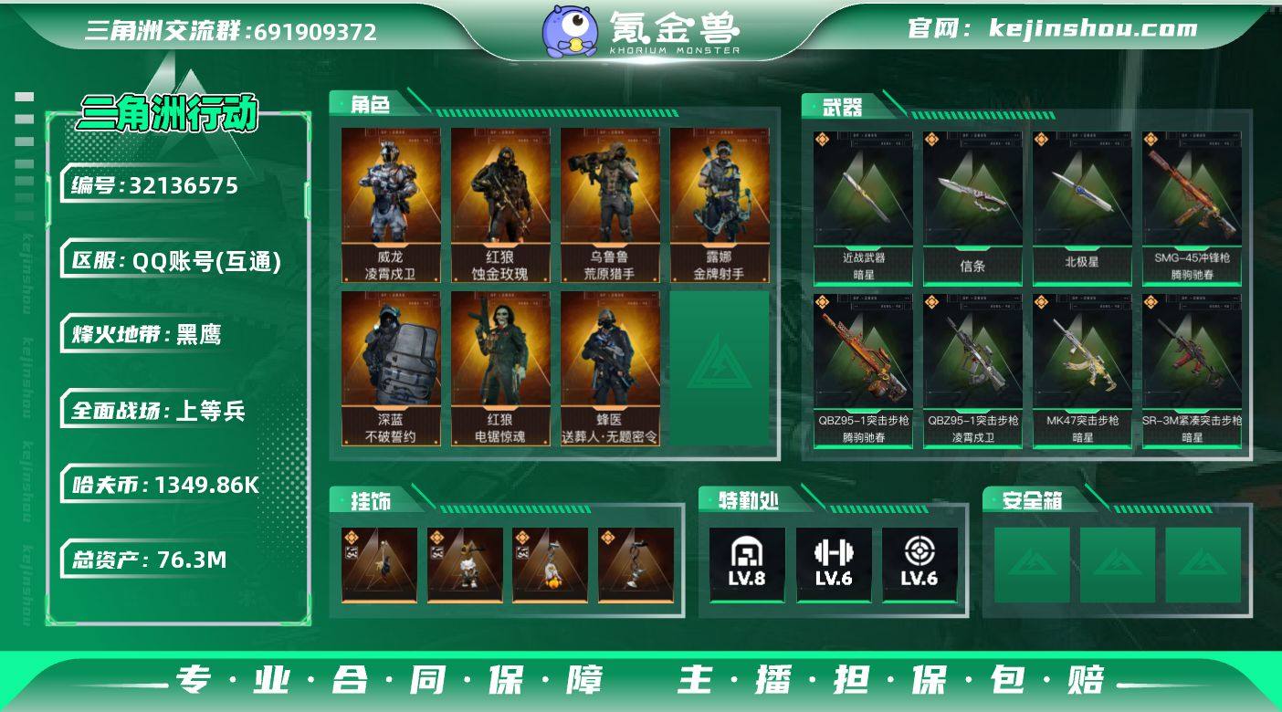 实名:不可二次实名 总资产:76.3M 哈夫币:1349.86K 烽火地带段位:黑鹰 烽火地带等级:60 全面战场段位:上等兵 全面战场等级:29 8级仓库,6级训练中心,6级靶场,5级指挥中心,1级潜水中心,3级防具台,3级工作台,3级制药台,3级技术中心,0级收藏室 战术部门等级:3 战斗部门等级:2 医疗部门等级:3 研发部门等级:2 后勤部门等级:2 曼德尔砖-气象感应:0 曼德尔砖-命运王牌:0 曼德尔砖-电玩高手:0 曼德尔砖-美杜莎:0