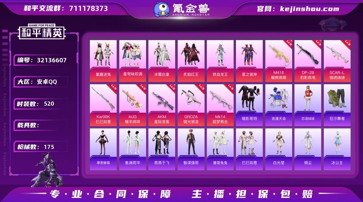 【特价出售】安卓Q-1稀有6粉装10特效枪10热门137套装175枪皮 50913热力值 6印记 历史超级王牌8星 【1稀有】 浪漫天命 【6粉装】 星穹咏叹调 童趣迷兔 冰霜白皇 炙焰红王 星之彼岸 铁血龙王 【10特效枪】 SCAR-L-锦绣绵绵 (5级) Kar98K-巳巳如意 (5级) DP-28-豹影疾电 (5级) AUG-暖羊咩咩 (5级) Mk14-甜梦熊击 (5级) GROZA-镜光银凌 (5级) AKM-星际浪客 (5级) M416-暖熊萌萌 (6级) Mk14-福马献瑞 (4级) AA12-G-萌骑幻想 (5级) 【10热门】 龟仙人 鹰眼刺客 TT战队服 暗影哥特 粉红小猪 狂沙舞者 破蛋小黄鸡 军刀雅典娜 M762-奇异狩猎者 S686-奇异狩猎者 【1头盔】 童趣迷兔头盔