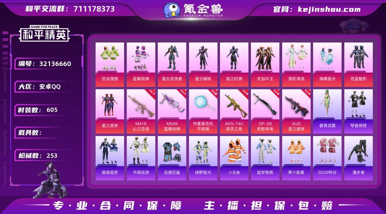 【特价出售】安卓Q-10粉装8特效枪17热门168套装253枪皮 85160热力值 16印记 历史超级王牌19星 【10粉装】 宙之时溯 星云暗核 莲影清波 苍蓝魅影 炙焰牛王 星之彼岸 海螺星光 恐龙拽拽 复仇流浪者 蓝莓炮弹 【8特效枪】 M416-心之恋语 (7级) AKS-74U-森灵之息 (4级) DP-28-豹影疾电 (4级) AUG-星之彼岸 (4级) M249-蓝莓炮弹 (7级) Mk14-福马献瑞 (5级) AA12-G-萌骑幻想 (2级) 平底锅-仲夏莫吉托 (6级) 【17热门】 小丑鱼 龟仙人 迅捷狂鲨 怪笑疯兔 赛罗奥特曼 醒狮腾龙 团圆交子 瑞龙福将 纯白誓言 粉红小猪 豚鼠丹丹 漫步者 韶华初心 朱雀圣者 英勇保护者 M762-瑞龙福将 M24-奇异狩猎者 【3飞行器】 星之彼岸飞行器 拂晓神骑飞行器 天之羽翼飞行器 【4头盔】 精灵迷巫头盔 梦幻火箭头盔 深海小丑鱼头盔 夏日绵绵冰头盔 【2背包】 梦幻火箭背包 神秘黑猫背包