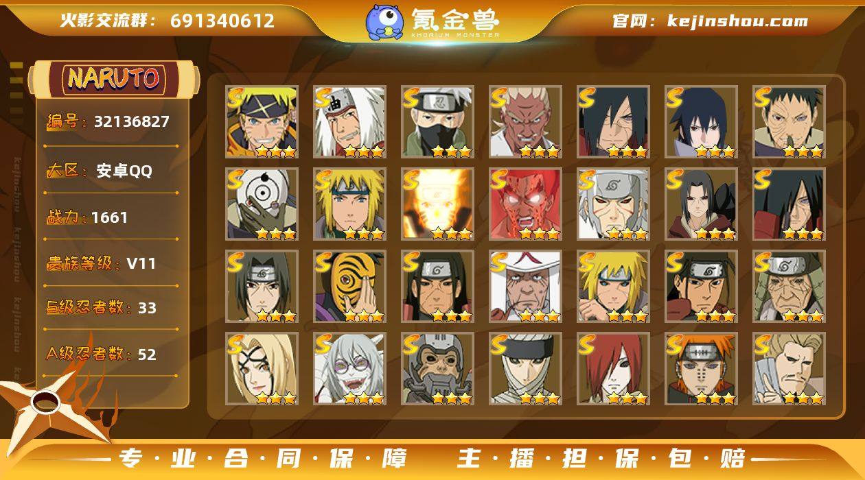 0B6TXK 号 VIP11,1661W战力,S忍35个,A忍57个,本服排名324,战区排名未上榜,通灵兽25个,8时装,点券795,金币6995,高招券23,暗部1阶,忍者星数724