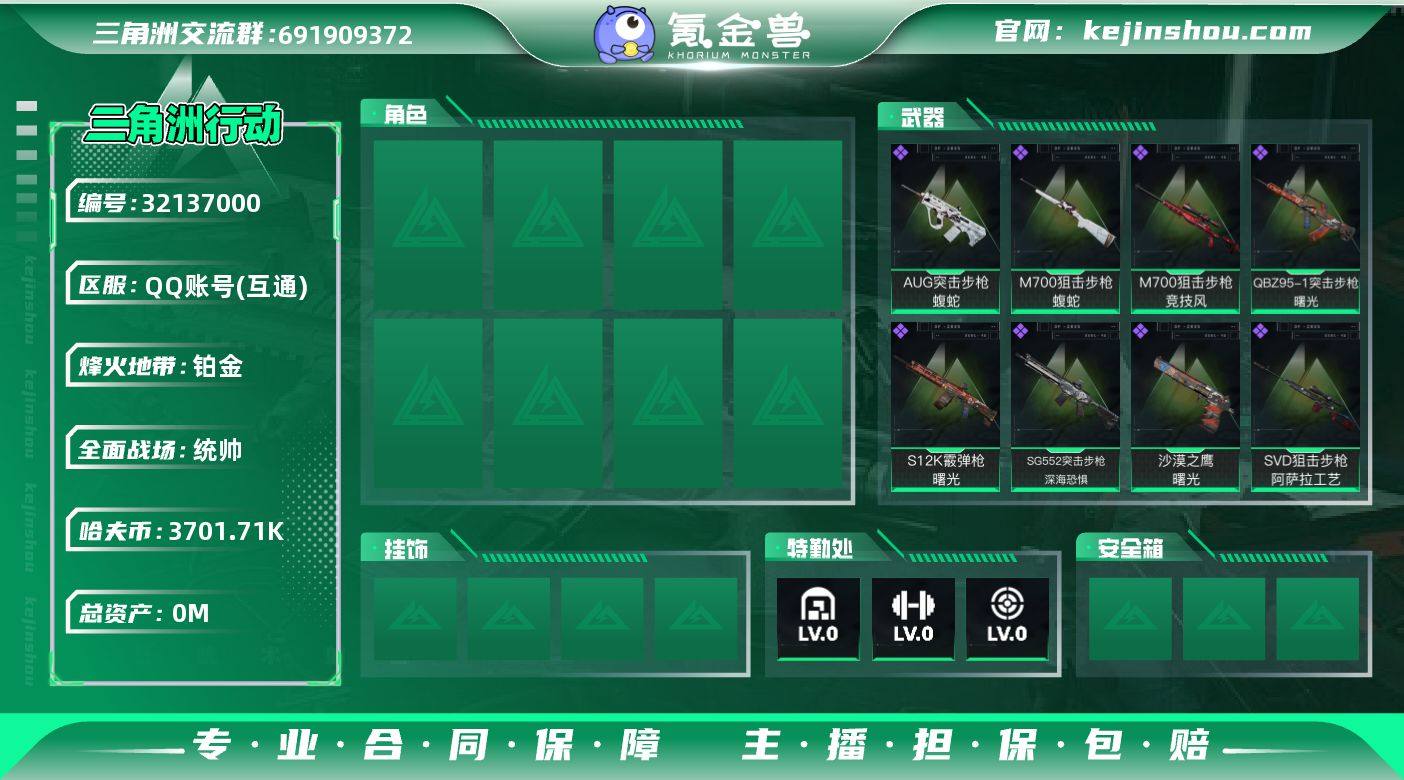 【特价出售/店主推荐】112m总资产-11k哈伏币-60烽火等级-钻石-27战场等级-军士长 【热门藏品】:非洲之心 【干员外观】:露娜-黑·天际线,红狼-电锯惊魂,露娜-金牌射手 【近战皮肤】:近战-信条,近战-处刑者1级,近战-黑鹰 【典藏外观】:M7战斗步枪-棱镜攻势S2,MP7冲锋枪-电玩高手S2 【典藏外观成色】:M7战斗步枪-棱镜攻势S2(优品B),MP7冲锋枪-电玩高手S2(优品A) 【传说外观】:M4A1突击步枪-阿米娅,ASh-12战斗步枪-鹅鸭杀,K416突击步枪-行动记录,M16A4突击步枪-狩猎时刻,SG552突击步枪-运动员,SCAR-H战斗步枪-水墨云图,SCAR-H战斗步枪-启航,G3战斗步枪-狩猎时刻,G3战斗步枪-骑士,CAR-15突击步枪-阿米娅,腾龙突击步枪-捞点薯条,P90冲锋枪-信条,Vector冲锋枪-狩猎时刻,勇士冲锋枪-能天使-午夜邮差,QCQ171冲锋枪-鹅鸭杀,M250通用机枪-骑士之心,QJB201轻机枪-鹅鸭杀,M14射手步枪-蛮荒,M14射手步枪-缄花,SKS射手步枪-骑士,SR-25射手步枪-信条,SR-25射手步枪-缄花,AWM狙击步枪-捞点薯条,.357左轮-缄花,93R-捞点薯条,复合弓-黑·天际线 【史诗外观】:AKM突击步枪-林中猎手,ASh-12战斗步枪-无极限,K416突击步枪-阿萨拉特攻,M16A4突击步枪-竞赛选手,M7战斗步枪-百步穿杨,SG552突击步枪-哈夫克警备,G3战斗步枪-流沙送葬,G3战斗步枪-哈夫克警备,AS Val突击步枪-百步穿杨,K437突击步枪-守护者,MP5冲锋枪-战术竞备,MP5冲锋枪-竞技风,Vector冲锋枪-阿萨拉文明,Vector冲锋枪-百步穿杨,SR-3M紧凑突击步枪-战术竞备,勇士冲锋枪-深海恐惧,MP7冲锋枪-守护者,MP7冲锋枪-六套之力,M1014霰弹枪-林中猎手,S12K霰弹枪-曙光,PKM通用机枪-蝮蛇,M249轻机枪-丛影谍踪,M250通用机枪-囚徒,QJB201轻机枪-炽焰,Mini-14射手步枪-守护者,VSS射手步枪-丛影谍踪,SVD狙击步枪-阿萨拉工艺,SV...
