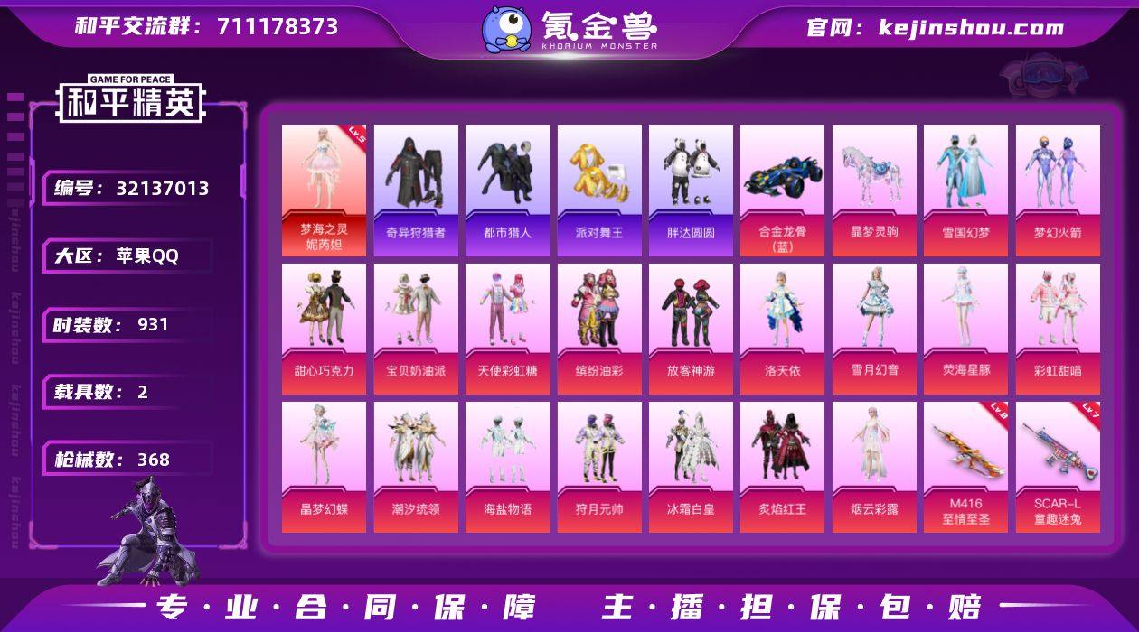 【特价出售】钱包无法注销苹果Q-1红装5稀有2载具19粉装12特效枪27热门254套装368枪皮 127630热力值 30印记 历史绝世王牌23星 【1红装】 梦海之灵-妮芮妲 (5级) 【5稀有】 奇异狩猎者 都市猎人 浪漫天命 派对舞王 派对舞王(金靴子) 【2载具】 合金龙骨蓝色 晶梦灵驹 【19粉装】 梦幻火箭 雪国幻梦 宝贝奶油派 天使彩虹糖 甜心巧克力 小舞雪昙 洛天依 雪月幻音 荧海星豚 烟云彩露 晶梦幻蝶 缤纷油彩 放客神游 狩月元帅 潮汐统领 冰霜白皇 炙焰红王 彩虹甜喵 海盐物语 【12特效枪】 M416-心之恋语 (3级) AKM-炫紫旋律 (1级) Kar98K-巳巳如意 (5级) M762-甜蜜誓约 (7级) DP-28-豹影疾电 (5级) AUG-暖羊咩咩 (5级) M200-梦海之灵 (3级) GROZA-巴啦啦小魔仙 (7级) SCAR-L-童趣迷兔 (7级) M416-至情至圣 (8级) AKM-梦之光华 (5级) Mk14-福马献瑞 (5级) 【27热门】 Mark.06 龟仙人 雪山精英 动感兔斯基 晶辉守护 鹰眼刺客 软萌银虎 迅捷狂鲨 金羽特工 胖达圆圆 暗夜契约 赛罗奥特曼 团圆交子 瑞龙福将 纯白誓言 豚鼠丹丹 漫步者 冰爽海盐 机械英豪 破蛋小黄鸡 风华少年志 白月香洋装 黑色刀锋 M416-魔法学院 M762-瑞龙福将 M249-古堡领主 Kar98K-古堡领主 【3飞行器】 梦幻火箭飞行器 古堡领主飞行器 幻海精灵飞行器 【7头盔】 童趣迷兔头盔 梦幻火箭头盔 雪国精灵头盔 甜心宝贝头盔 智能音符头盔 甜蜜誓约头盔 心之恋语头盔 【6背包】 梦幻火箭背包 雪国精灵背包 甜心宝贝背包 古堡领主背包 甜蜜誓约背包 花间之火背包