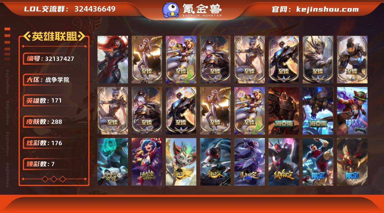 单双黄金段位-171英雄-288皮肤-176炫彩-1终极-18神话-38限定-27传说-58史诗 【神话皮肤】:十周年纪念安妮,源代码乐芙兰,十五周年纪念希维尔,神凰行者瑞羽圣凰艾尼维亚,海克斯科技阿利斯塔,恐惧新星德莱厄斯,至臻电玩女神凯特琳,至臻电玩女神凯特琳2022,至臻KDA卡莎,至臻KDA卡莎2022,至臻魔女婕拉,至臻未来战士锤石,至臻未来战士锤石2022,至臻未来战士卢锡安,至臻源计划正义艾瑞莉娅,至臻源计划正义艾瑞莉娅2022,至臻玉剑传说武剑仙,至臻玉剑传说武剑仙2022 【至臻皮肤】:至臻源计划正义艾瑞莉娅,至臻源计划:正义艾瑞莉娅(2022),至臻电玩女神凯特琳,至臻电玩女神凯特琳(2022),至臻玉剑传说武剑仙锐雯,至臻玉剑传说武剑仙(2022),至臻魔女婕拉,至臻KDA卡莎,至臻KDA卡莎(2022),至臻未来战士卢锡安,至臻未来战士锤石,至臻未来战士锤石(2022) 【臻彩皮肤】:无畏骑士瑟庄妮赤子初心,征服者阿利斯塔炫金,最终BOSS维迦里大魔王,可爱可爱粉红红布里茨,魔女阿卡丽虚荣,净雪之月莫甘娜冬虹 【年限皮肤】:银龙裁决泰隆,广寒仙子嫦娥,王国机神朱雀蕾欧娜,天龙之子斯莫德,龙马烈焰波比 【海克斯皮肤】:海克斯科技阿利斯塔,恐惧新星德莱厄斯 【冰雪限定】:圣诞精灵崔丝塔娜,圣诞狂欢努努和威朗普,圣诞糖果棒厄运小姐,阿木木“主人不要我了”,喜庆之树茂凯,圣诞玩偶波比,魄罗骑士瑟庄妮,圣诞捣蛋鬼金克丝 【终极皮肤】:武装战姬厄运小姐 【限定皮肤】:SKTT1贾克斯,SSW图奇,SSW泰隆,SSW雷恩加尔,iG菲奥娜,iG艾瑞莉娅,iG卡蜜尔,iG卡莎,iG乐芙兰,iG洛,DWG蕾欧娜,勇敢的心德莱厄斯,胜利女神奥莉安娜,胜利之剑亚托克斯,胜利枪神卢锡安,胜利女神瑟庄妮,魅惑女巫奈德丽,泳池派对奥莉安娜,泳池派对李青,泳池派对塔莉垭,暗影沃里克,都铎王朝图奇,征服者阿利斯塔...