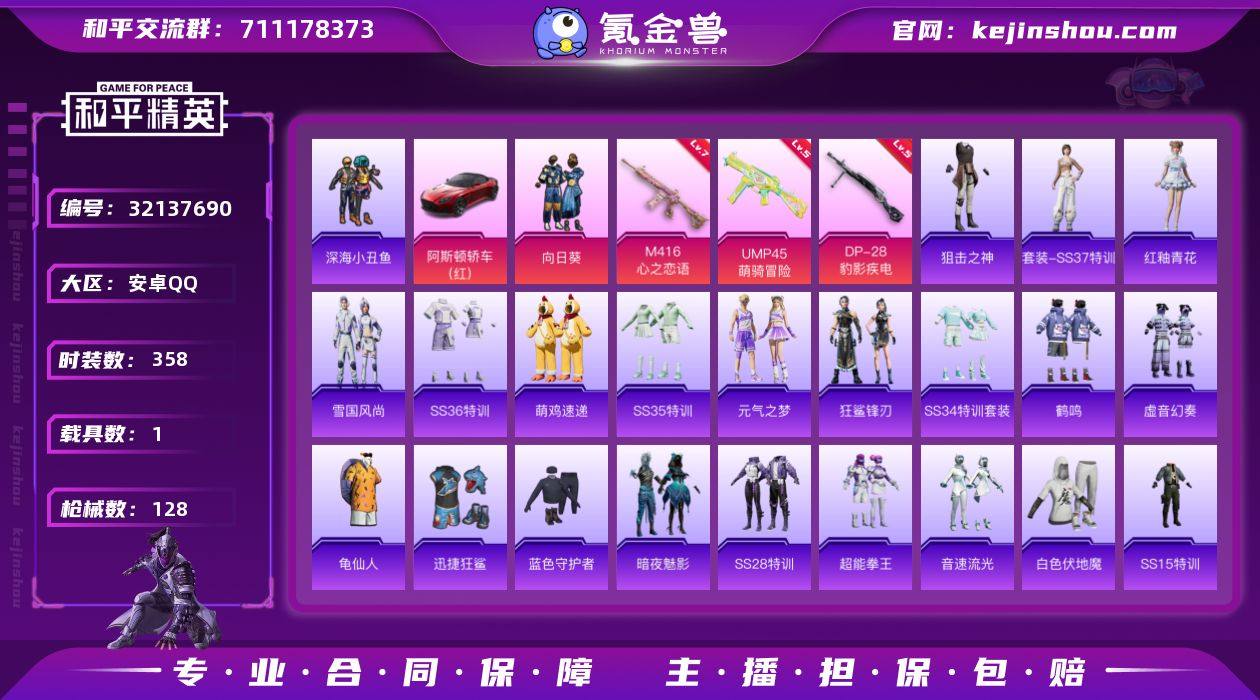 实名:不可二次实名 是否支持人脸包赔:支持 粉装数量:1 特效枪数量:3 载具数:1 时装数:358 枪械数:128 深海小丑鱼 向日葵 七级M416-心之恋语,五级UMP45-萌骑冒险,五级DP-28-豹影疾电 阿斯顿·马丁DBS(红) 狙击之神,红釉青花,SS37特训,雪国风尚,SS36特训,炫彩糖果,萌鸡速递,SS35特训,元气之梦,狂鲨锋刃,SS34特训套装,暗夜魅影,冰川特警,缤纷果语,白虎圣者,白色伏地魔,长空猛禽,潮流游乐家,超能拳王,呆萌铁蟹,飞驰魅影,粉红小猪,福星高照,龟仙人,海岛探路者,鹤鸣,红酒骑士,湖蓝色名流,黑色伏地魔,灰色格斗者,海上生明月,幻世战舞者,辉星之火,竞技名士,吉莉礼服,空岛之星,龙的传人,黎明保卫者,蓝色守护者,萌黄之夏,魅力单车,麻辣教官,萌趣颜团子,逆风勇士,怒火燎原,牛气冲天,牛气满满,欧布奥特曼,破蛋小黄鸡,青春冒险家,奇趣章鱼,骑行爱好者,瑞龙福将,人气偶像,深海小丑鱼,SS10特训,SS11特训,SS12特训,SS13特训,SS14特训,SS15特训,SS17特训,SS18特训,SS19特训,SS20特训,SS21特训,SS22特训,SS23特训,SS25特训,SS26特训,SS27特训,SS28特训,SS9特训,时尚圣诞,探宝勇士,天籁歌者,甜蜜告白,甜蜜熊情侣,豚鼠丹丹,特殊使命,甜心亚梦,团圆交子,特种颜团子,特战装甲,完美偶像,迅捷狂鲨,虚音幻奏,原初圣火,音速流光 极意拳锋飞行器,炫彩糖果飞行器,天之羽翼飞行器,炫彩糖果降落伞,怪笑疯兔降落伞,烈焰拳霸降落伞,旋转彩虹降落伞,心之恋语降落伞,银刃赛罗降落伞,炙焰牛王降落伞