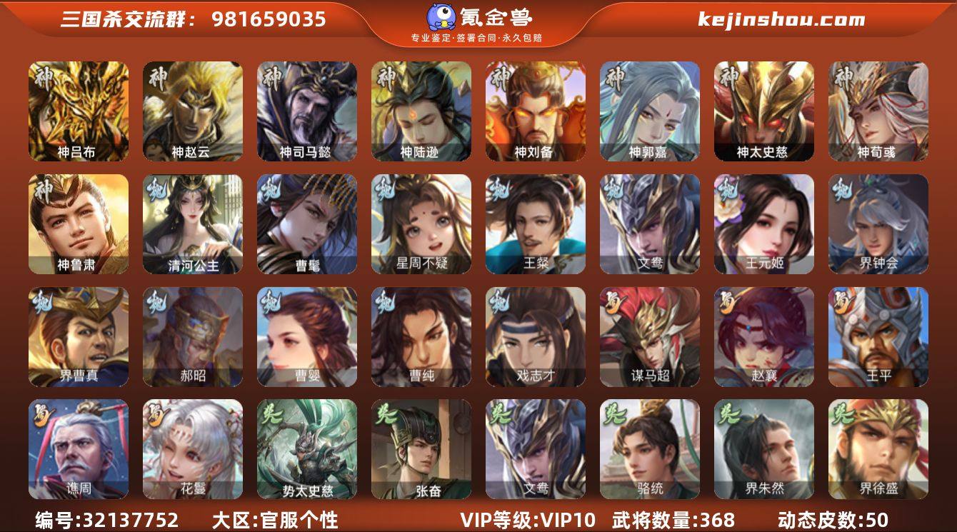 【616】官阶:大将军;VIP等级:VIP10;史诗武将数量:47;动态皮肤数量:50;武将总数:368;史诗宝珠数量:62;将魂数量:5118;神将:11;魏国史诗武将:20;蜀国史诗武将:5;吴国史诗武将:5;群史诗武将:15 神吕布,神赵云,神司马懿,神陆逊,神刘备,神郭嘉,神太史慈,神荀彧,神吕蒙,神周瑜,神鲁肃,曹髦,星周不疑,王粲,文鸯,王元姬,魏-司马昭,界钟会,界曹真,郝昭,曹婴,曹纯,戏志才,清河公主,谋马超,赵襄,王平,谯周,花鬘,张奋,骆统,界朱然,界徐盛,势太史慈,左慈,张琪瑛,星黄忠,星甘宁,苏飞,麹义,庞德公,界左慈,界李儒,公孙康,卑弥呼,谋张角,阎象,友徐庶,星董卓,神鲁肃-九州为局,神郭嘉-虎年清明(动态),神郭嘉-倚星折月(动态),神太史慈-勇撼日月(动态),神孙策-霸王再世(动态),神荀彧-虎年清明(动态),神荀彧-匡汉延祚(动态),神张辽-散敌擒孙,神甘宁-万人辟易(动态),神陆逊-绽焰摧枯(动态),神吕布-监兵噬魅(动态),神司马懿-鉴往知来(动态),星周不疑-才广志宏(动态),曹植-龙年中秋(动态),钟会-谋谟之勋(动态),界钟会-谋谟之勋(动态),曹昂-竭战麟伤(动态),曹纯-长坂败备(动态),王元姬-鼠年冬至(动态),司马昭-昭威淮南(动态),星徐晃-斧引霹雳(动态),清河公主-魅影萦心(动态),刘备-龙御天下(动态),费祎-安民护祚(动态),关羽-明良千古(动态),马超-牛年春节(动态),界马超-牛年春节(动态),关银屏-虎年端午(动态),诸葛果-蛇年限定(动态),卧龙诸葛-火烧博望(动态),吕蒙-剑起惊澜(动态),孙寒华-莲华熠熠(动态),徐盛-破军杀将(动态),灵雎-霜刃绚练(动态),麹义-扬刀立威(动态),吕布-鼠年七夕(动态),界吕布-鼠年七夕(动态),李儒-鸠杀少帝(动态),界李儒-鸠杀少帝(动态),杨彪-忧心国事(动态),皇甫嵩-奋钺振旅(动态),左慈-蛇年限定(动态)
