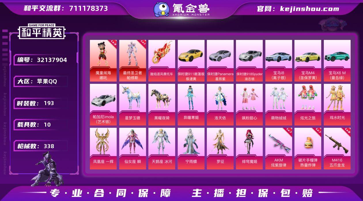 TD263719 苹果 手Q-2神装-13粉装-24特效枪-10载具-11粉色飞行器-124037热力值-17王牌印记-193套装-338枪皮 【红色神装等级】:魔童闹海-哪吒(三级),最终圣卫者-帕修斯(一级) 【红色角色神装】:魔童闹海-哪吒,最终圣卫者-帕修斯 【热门品类】:套装-龟仙人,套装-粉红小猪 【粉色套装】:角色-洛天依,粉装-飒粉甜心,粉装-萌物绒绒,粉装-炫光之旅,粉装-戏水时光,角色-凤凰座 一辉,角色-仙女座 瞬,角色-天鹅座 冰河,角色-宁雨蝶,角色-罗征,角色-绯穹魔姬,角色-异瞳寒姬,角色-千仞雪 【粉色枪皮等级】:AKM-炫紫旋律(七级),SCAR-L-锦绣绵绵(五级),SCAR-L-魔童闹海 哪吒(三级),M416-五爪金龙(六级),M416-女娲灵识(六级),M416-灵猫魔法师(一级),GROZA-镜光银凌(五级),AUG-星梦奇缘(三级),AUG-暖羊咩咩(五级),M762-青锋波束(五级),Vector-最终圣卫者(三级),汤姆逊-热量炸弹(五级),AKS-74U-森灵之息(五级),Kar98K-巳巳如意(五级),Mk14-甜梦熊击(五级),Mk14-福马献瑞(五级),AMR-智耀战神(五级),AA12-G-萌骑幻想(二级),DP-28-豹影疾电(五级),MG3-洛神天依(二级),MG-36-沧焰双生(五级),烟雾弹-电雾迷城(四级),燃烧瓶-薄荷可可(六级),破片手榴弹-热量炸弹(七级) 【粉色载具】:宝马i8(离子银),宝马M4(圣保罗黄),宝马X6 M(曼岛绿),帕加尼imola(艺术银),保时捷911 敞篷版(极速黄),保时捷Panamera(星辰紫),保时捷918 Spyder(液态银),踏焰逐风摩托车,僚机-萌兔起飞,星梦玉骢,黑曜夜骑 【粉色枪皮】:AKM-炫紫旋律,SCAR-L-锦绣绵绵,SCAR-L-魔童闹海 哪吒,M416-五爪金龙,M416-女娲灵识,M416-灵猫魔法师,GROZA-镜光银凌,AUG-星梦奇缘,AUG-暖羊咩咩,M762-青锋波束,Vector-最终圣卫者,汤姆逊-热量炸弹,AKS-74U-森灵之息,Kar98K-巳巳如意,Mk14-甜梦熊击,M...