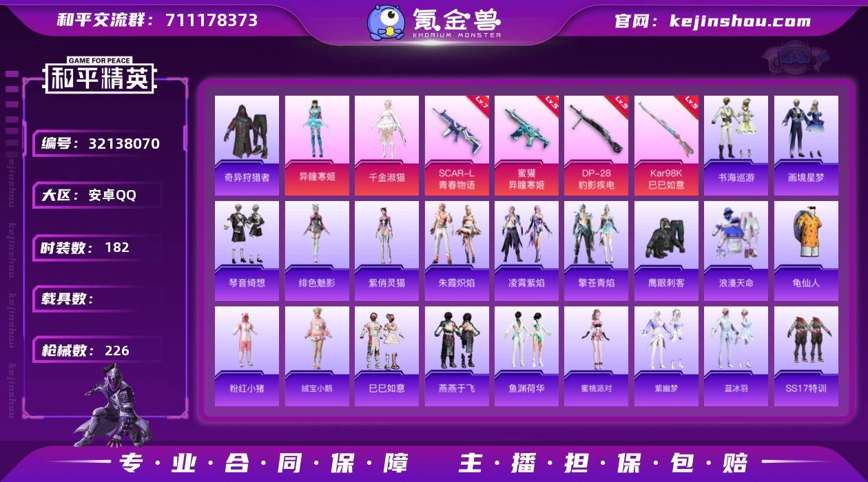 安卓 手Q-2粉装-7特效枪-0载具-1粉色飞行器-65128热力值-14王牌印记-182套装-226枪皮 【热门品类】:套装-浪漫天命,套装-奇异狩猎者,套装-龟仙人,套装-粉红小猪 【粉色套装】:角色-千金淑猫,角色-异瞳寒姬 【粉色枪皮等级】:SCAR-L-青春物语(七级),蜜獾-异瞳寒姬(五级),AKS-74U-森灵之息(五级),Kar98K-巳巳如意(五级),Mk14-福马献瑞(五级),AA12-G-萌骑幻想(五级),DP-28-豹影疾电(五级) 【粉色枪皮】:SCAR-L-青春物语,蜜獾-异瞳寒姬,AKS-74U-森灵之息,Kar98K-巳巳如意,Mk14-福马献瑞,AA12-G-萌骑幻想,DP-28-豹影疾电 【粉色飞行器】:炫彩糖果飞行器 【粉色降落伞】:绝对恒星降落伞,环太平洋降落伞,未来歌姬降落伞,精灵梦叶罗丽降落伞,忍者神龟降落伞,异瞳寒姬降落伞,炫彩糖果降落伞 【稀有套装】:套装-龟仙人,套装-绒宝小鹅,套装-巳巳如意,套装-雪国风尚,套装-炫彩糖果,套装-彩虹骑师,套装-马上来财,套装-燕燕于飞,套装-鱼渊荷华,角色-蜜桃派对,套装-紫幽梦,套装-蓝冰羽,套装-朱霞炽焰,套装-凌霄紫焰,套装-擎苍青焰,角色-绯色魅影,角色-紫俏灵猫,套装-书海巡游,套装-画境星梦,套装-琴音绮想,套装-雨过天青,套装-红釉青花 【稀有枪皮】:AUG-冰晶雪宝,AKM-影袭,AKM-灼热熔岩,AKM-破晓战魂,AKM-萌趣颜团子,AKM-霓虹街区,AKM-龙的传人,M16A4-幻世战舞者,M16A4-甜心亚梦,SCAR-L-炫彩节奏,SCAR-L-玉兔迎春,SCAR-L-红色方程式,M416-糯团青竹,M416-红色方程式,M416-绯红前夜,M416-蓝色火焰,GROZA-异彩先驱,GROZA-影袭,GROZA-懵萌河马,GROZA-蓝莓炮弹,AUG-甜蜜菠萝,AUG-耀粉歌者,QBZ-飞驰魅影,M762-天降萌叽,M762-瑞龙福将,M762-绯红前夜,M762-登顶巅峰,G36C-懵萌河马,G36C-青丘仙客,AC-VAL-天降萌叽,AC-VAL-快闪甜心,AC-VAL-甜心亚梦,A...