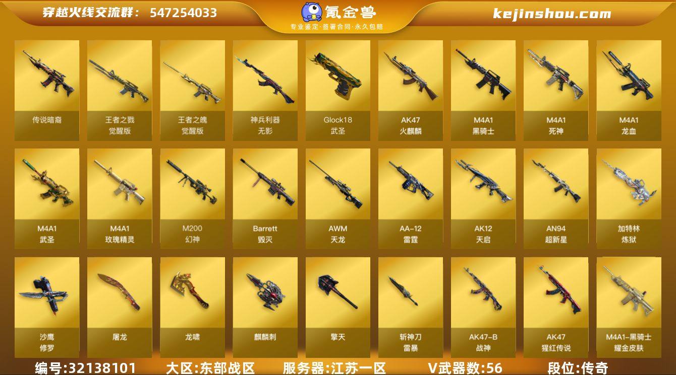 江苏一区-60V-2王者武器数-0炫金武器数 【传说武器】:传说暗裔 【热门武器】:传说暗裔,M4A1-青龙,M200-幻神,死亡之眼,C.A.T,M4A1-黑骑士,加特林-炼狱*2,金色蔷薇-空,斯泰尔-蝴蝶,羊驼玩偶,沙鹰-修罗*2 【音效卡】:M4A1-黑骑士音效卡,Barrett-毁灭音效卡 【皮肤】:M200-幻神-黄忠皮肤,Scar Light-白虎-暗星,火麒麟-雷神,火麒麟-华夏之心,毁灭-星空,毁灭-魔灵皮肤,毁灭-英雄计划 皮肤,黑骑士耀金皮肤,战神-紫绶金章皮肤,战神-流金岁月皮肤*2,天龙-能量核心,AWM-天龙-传奇70KG,擎天-冠军之击 【角色】:葵,奇洋探员,乔伊教练,修道士,云海玲珑,芳心审判者,风暴女,虎妞,嘉年华灵狐,娟娟,卡塔琳娜,葵-赛博朋克,灵狐者-X,灵狐者-黄金海岸,龙儿,麻雀,潘多拉-X,潜龙队-X,斯沃特-X,铁骑荣耀,兔囡囡,新娜塔莎,影武者-X,职业选手 【人偶武器】:M4A1-雷神-精英刀锋,金色蔷薇-空,斯泰尔-蝴蝶,AWM-灵狐-15周年嘉年华,COP-旗袍,C.A.T,迷你深渊冰龙*2,迷你波特博士,迷你牛牛,生化手雷-机甲核心,深渊终结者手雷,闪光弹-小乔,迷你超能女侍 【暴走生化】:黑龙吞噬者,死亡之眼 【挑战大师】:AK47-冰龙粉碎者*2,激光毁灭者III,试炼破坏者III,神圣爆裂者-末日III 【英雄级武器】:AK47-火麒麟,M4A1-黑骑士,M4A1-死神,AK12-天启,AN94-超新星,M4A1-武圣,M4A1-龙血,M4A1-青龙,无影-神兵利器,M4A1-玫瑰精灵,王者之魄-觉醒版,王者之戮-觉醒版,AK-47-猩红传说*7,AK47-B-战神,AWM-天龙,Barrett-毁灭,M200-幻神,Barrett-金色蔷薇,加特林-炼狱*2,AA-12-雷霆*2,沙鹰-修罗*2,Glock18-武圣,屠龙,龙啸,马来剑-夜魔,擎天,麒麟刺,斩神刀-雷暴,高爆手雷-雷霆*2,高爆手雷-雷暴,高爆手雷-夜魔,高爆手雷-神工天巧,闪光弹-雷霆*2,闪光弹-雷暴,闪光弹...