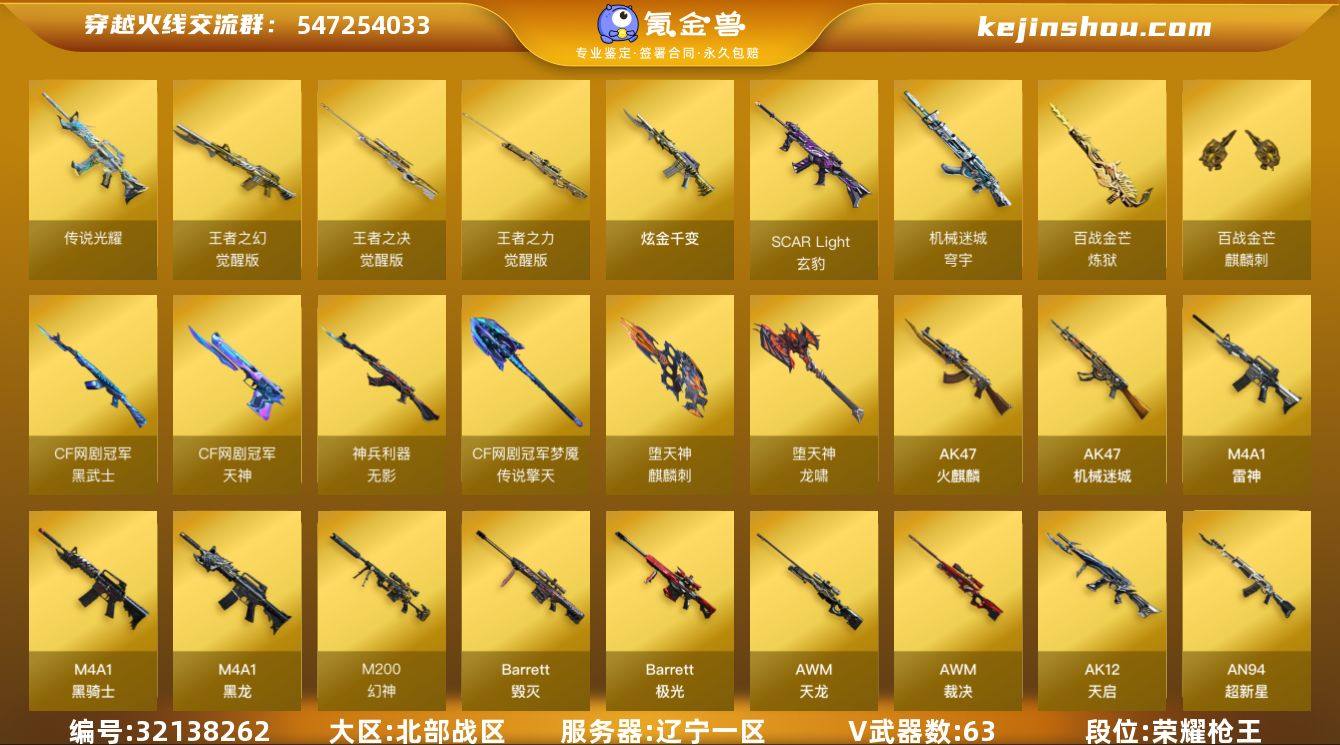 辽宁一区-72V-5王者武器数-1炫金武器数 【传说武器】:传说光耀 【热门武器】:传说光耀,QBZ03-金色蔷薇,HK417-朱雀,M200-幻神,死亡之眼,牛牛-AK47,M4A1-黑骑士*3,加特林-炼狱,沙鹰-修罗*2,炽芒蝶刃,金刚伞 【王者炫金武器】:王者森力,炫金千变 【音效卡】:M4A1-雷神音效卡,Barrett-毁灭音效卡,Barrett-碧霄极光音效卡,炼狱-百战金芒-庆典舞曲音效卡 【皮肤】:AWM-裁决-百城联赛天津皮肤,AWM-裁决-凤灵皮肤,雷神-荣耀之魄,雷神-虎将*2,M4A1-再燃火线,雷神-神秘按键 皮肤,火麒麟-心动糖果,毁灭耀金皮肤,毁灭-航天科技皮肤,毁灭-虹光风暴 皮肤,毁灭-英雄计划 皮肤,黑骑士-暗月,黑骑士耀金皮肤,AWM-天龙-传奇70KG,极光-能量核心,轻型军用手斧-再燃火线 【角色】:樱,晴雅,审判者,零·纪元,战地猎狐,王者-瞳-闭月羞花,乔伊教练,修道士,云海玲珑,葵-阿尔法武装,暗夜-X,初恋灵狐,风暴女,嘉年华灵狐,卡塔琳娜,灵狐者-X,灵狐者-黄金海岸,灵狐者-七夕宝贝,曼陀罗-X,潜龙队-X,斯沃特-X,铁骑荣耀,兔囡囡 【人偶武器】:火麒麟-灵狐*2,AWM-灵狐-15周年嘉年华*3,COP-旗袍,牛牛-AK47,迷你裂空之翼,迷你牛魔王,迷你牛牛,迷你生化手雷*2,生化手雷-机甲核心 【暴走生化】:死亡之眼,超级对讲机 【挑战大师】:冰龙粉碎者-白马银枪,激光毁灭者III-白马银枪,神圣爆裂者-末日III 【英雄级武器】:AK47-火麒麟*2,M4A1-黑龙,M4A1-雷神,M4A1-黑骑士*3,AK12-天启,AN94-超新星,AK47-机械迷城,HK417-朱雀,无影-神兵利器,SCAR Light-玄豹,QBZ03-独角-III,QBZ03-金色蔷薇,9A91-烈火,王者之幻-觉醒版,黑武士-CF网剧冠军,机械迷城-穹宇,AWM-天龙,Barrett-毁灭*2,Barrett-极光,AWM-裁决*2,M200-幻神,王者之力-觉醒版,王者之决-觉醒版,加特林-炼狱,炼狱-...