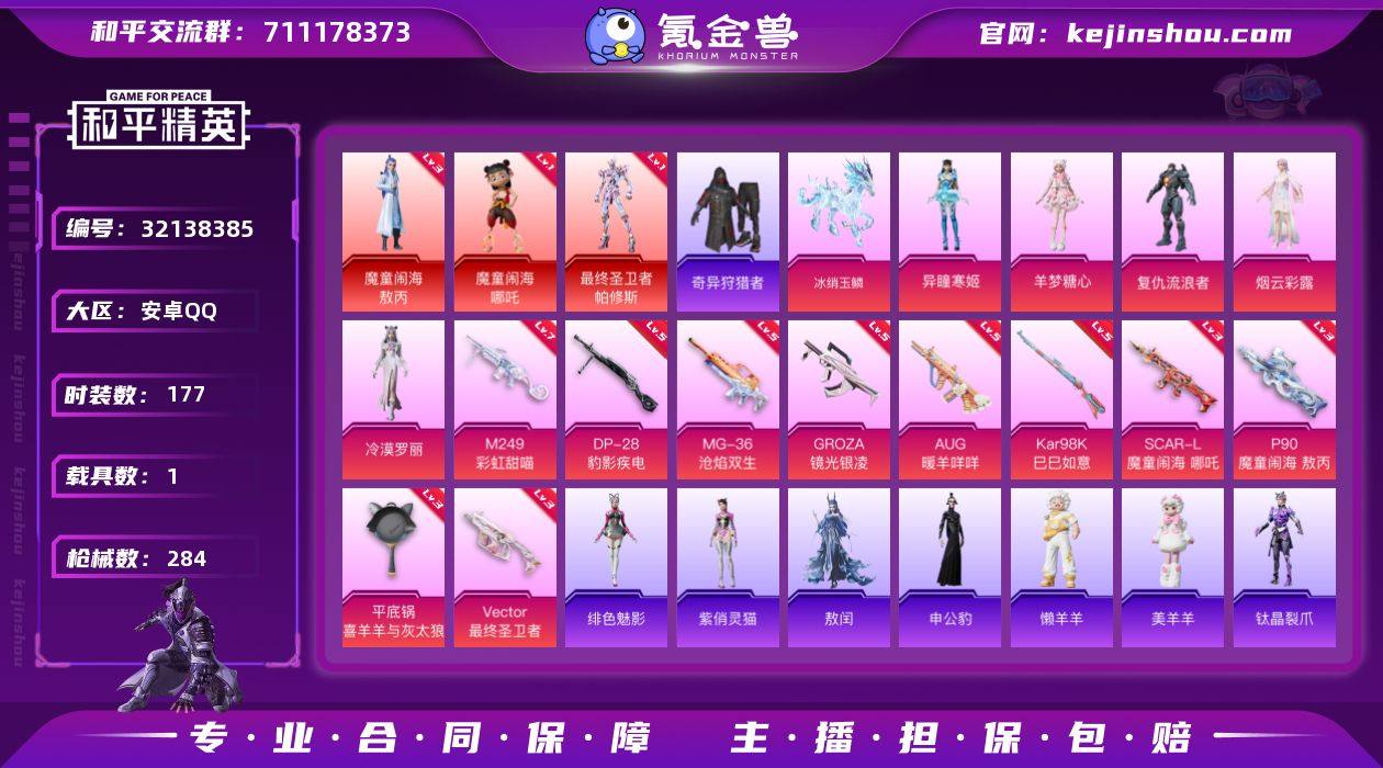 安卓 手Q-3神装-5粉装-11特效枪-1载具-9粉色飞行器-95054热力值-12王牌印记-177套装-284枪皮 【红色神装等级】:魔童闹海-敖丙(三级),魔童闹海-哪吒(一级),最终圣卫者-帕修斯(一级) 【红色角色神装】:魔童闹海-敖丙,魔童闹海-哪吒,最终圣卫者-帕修斯 【热门品类】:套装-奇异狩猎者,套装-龟仙人 【粉色套装】:角色-复仇流浪者,角色-烟云彩露,角色-冷漠罗丽,角色-羊梦糖心,角色-异瞳寒姬 【粉色枪皮等级】:SCAR-L-魔童闹海 哪吒(三级),GROZA-镜光银凌(五级),AUG-暖羊咩咩(五级),Vector-最终圣卫者(三级),P90-魔童闹海 敖丙(三级),Kar98K-巳巳如意(五级),Mk14-福马献瑞(一级),M249-彩虹甜喵(七级),DP-28-豹影疾电(五级),MG-36-沧焰双生(五级),平底锅-喜羊羊与灰太狼(三级) 【粉色载具】:僚机-冰龙团团,冰绡玉鳞 【粉色枪皮】:SCAR-L-魔童闹海 哪吒,GROZA-镜光银凌,AUG-暖羊咩咩,Vector-最终圣卫者,P90-魔童闹海 敖丙,Kar98K-巳巳如意,Mk14-福马献瑞,M249-彩虹甜喵,DP-28-豹影疾电,MG-36-沧焰双生,平底锅-喜羊羊与灰太狼 【粉色飞行器】:炫彩糖果飞行器,神秘黑猫飞行器,天之羽翼飞行器,闪光银龙飞行器,墨金战记飞行器,终晖之翼飞行器,飞天猪飞行器,灵珠游龙飞行器 【粉色降落伞】:绝对恒星降落伞,百万伏特降落伞,王牌四分卫降落伞,星之彼岸降落伞,洛神天依降落伞,恐龙拽拽降落伞,环太平洋降落伞,千面幻镜降落伞,旋转彩虹降落伞,第五大道降落伞,梦幻舞会降落伞,精灵梦叶罗丽降落伞,临安公主降落伞,星穹咏叹调降落伞,最终圣卫者降落伞,冷漠罗丽降落伞,喜羊羊与灰太狼降落伞,魔童闹海 哪吒降落伞,魔童闹海 敖丙降落伞,异瞳寒姬降落伞,炫彩糖果降落伞 【稀有套装】:套装-龟仙人,玩偶服-憨乐熊二,套装-巳巳如意,套装-雪国风尚,套装-炫彩糖果,套装-...