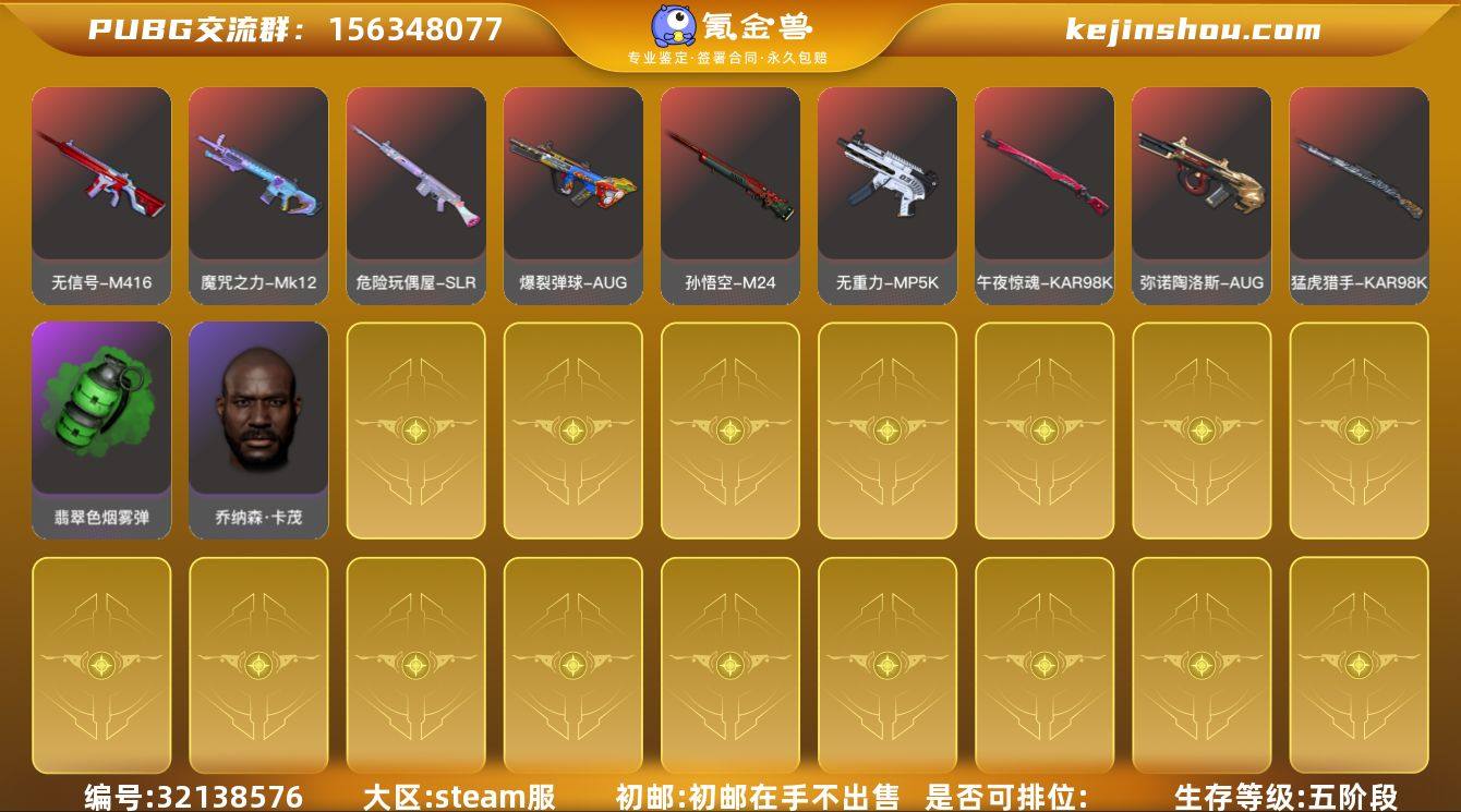 [LCX86]9级玩偶炮 5级孙悟空M24 2级妖魔之触ACE 2级爆裂AUG 2级无信号M4 2级魔咒之力Mk12 1级猛虎98k 1级午夜惊魂98K 1级无重力MP5K 1级弥诺陶洛斯AUG 1级烈日灼烧-S1897 1级寒蚀MP5K 翡翠色烟雾弹 紫色魔法迷雾-M79 蓝色魔法迷雾-M79 张图纸 柏林鞋 兰博基尼奢华版 交易所接待室 黑鬼 滑雪镜 渔夫帽 红面巾 黑大衣 白战神 活动绿东 发光手臂 白熊鞋 车漆 小马尾 青海摇 西游记