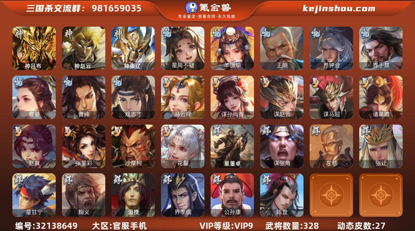【670】官阶:骠骑将军;VIP等级:VIP9;史诗武将数量:33;动态皮肤数量:27;武将总数:328;史诗宝珠数量:90;将魂数量:10290;神将:5;魏国史诗武将:10;蜀国史诗武将:10;吴国史诗武将:0;群史诗武将:12 神吕布,神赵云,神张辽,神吕蒙,神周瑜,星周不疑,羊徽瑜,王朗,魏-司马昭,界钟会,界于禁,曹婴,曹纯,戏志才,马云騄,谋孙尚香,谋赵云,谋马超,诸葛瞻,赵襄,张星彩,沙摩柯,花鬘,谋荀彧,左慈,张让,星甘宁,麹义,沮授,界李儒,公孙康,陈登,谋张角,友徐庶,星董卓,神张辽-散敌擒孙,神吕布-监兵噬魅(动态),戏志才-举棋若定(动态),曹婴-兔年春节(动态),羊徽瑜-牛年中秋(动态),司马师-牛年中秋(动态),司马昭-昭威淮南(动态),刘备-龙御天下(动态),马超-牛年春节(动态),赵云-牛年春节(动态),界赵云-牛年春节(动态),界马超-牛年春节(动态),SP孙尚香-明良千古(动态),关银屏-兔年春节(动态),马云騄-牛年春节(动态),张星彩-临军对阵(动态),卧龙诸葛-火烧博望(动态),周处-义除三害(动态),陆逊-龙年七夕(动态),孙尚香-兔年春节(动态),孙尚香-星流霆击(动态),界孙尚香-星流霆击(动态),灵雎-霜刃绚练(动态),麹义-扬刀立威(动态),貂蝉-鼠年七夕(动态),界貂蝉-鼠年七夕(动态),星甘宁-锦帆游侠(动态)