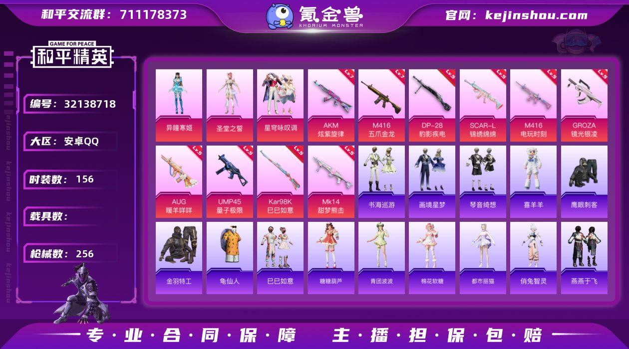 安卓 手Q-3粉装-11特效枪-0载具-1粉色飞行器-76145热力值-14王牌印记-156套装-256枪皮 【热门品类】:套装-金羽特工,套装-龟仙人 【粉色套装】:角色-圣堂之誓,粉装-星穹咏叹调,角色-异瞳寒姬 【粉色枪皮等级】:AKM-炫紫旋律(七级),SCAR-L-锦绣绵绵(五级),M416-五爪金龙(七级),M416-电玩时刻(五级),GROZA-镜光银凌(五级),AUG-暖羊咩咩(五级),UMP45-量子极限(五级),AKS-74U-森灵之息(五级),Kar98K-巳巳如意(五级),Mk14-甜梦熊击(五级),DP-28-豹影疾电(五级) 【粉色枪皮】:AKM-炫紫旋律,SCAR-L-锦绣绵绵,M416-五爪金龙,M416-电玩时刻,GROZA-镜光银凌,AUG-暖羊咩咩,UMP45-量子极限,AKS-74U-森灵之息,Kar98K-巳巳如意,Mk14-甜梦熊击,DP-28-豹影疾电 【粉色飞行器】:炫彩糖果飞行器 【粉色降落伞】:梦幻火箭降落伞,飒粉甜心降落伞,未来歌姬降落伞,闲梦青缨降落伞,智耀战神降落伞,星穹咏叹调降落伞,绯穹魔姬降落伞,异瞳寒姬降落伞,炫彩糖果降落伞,罪夜之冕降落伞,镜花水月降落伞 【稀有套装】:套装-龟仙人,套装-巳巳如意,套装-雪国风尚,套装-炫彩糖果,套装-糖糖葫芦,套装-青团波波,套装-棉花软糖,角色-都市丽猫,角色-俏兔智灵,套装-燕燕于飞,套装-鱼渊荷华,套装-粉恋花,套装-紫幽梦,套装-蓝冰羽,角色-瑰梦爱神,套装-星渊小夜曲,套装-极速光影,套装-云朵鹅,套装-雪绒豹,玩偶服-喜羊羊,套装-书海巡游,套装-画境星梦,套装-琴音绮想 【稀有枪皮】:AKM-夜灯,AKM-彩虹符号,AKM-星之彼岸,AKM-江南烟雨,AKM-灼热熔岩,AKM-缤纷海域,AKM-霓虹街区,AKM-龙的传人,M16A4-凝视深渊,M16A4-幻世战舞者,M16A4-甜心亚梦,M16A4-千金淑猫,SCAR-L-炫彩节奏,SCAR-L-玉兔迎春,SCAR-L-银碳小老虎,M416-糯团青竹,M416-红色方程式,M416-蓝色火焰,M416-黄金狮王,G...