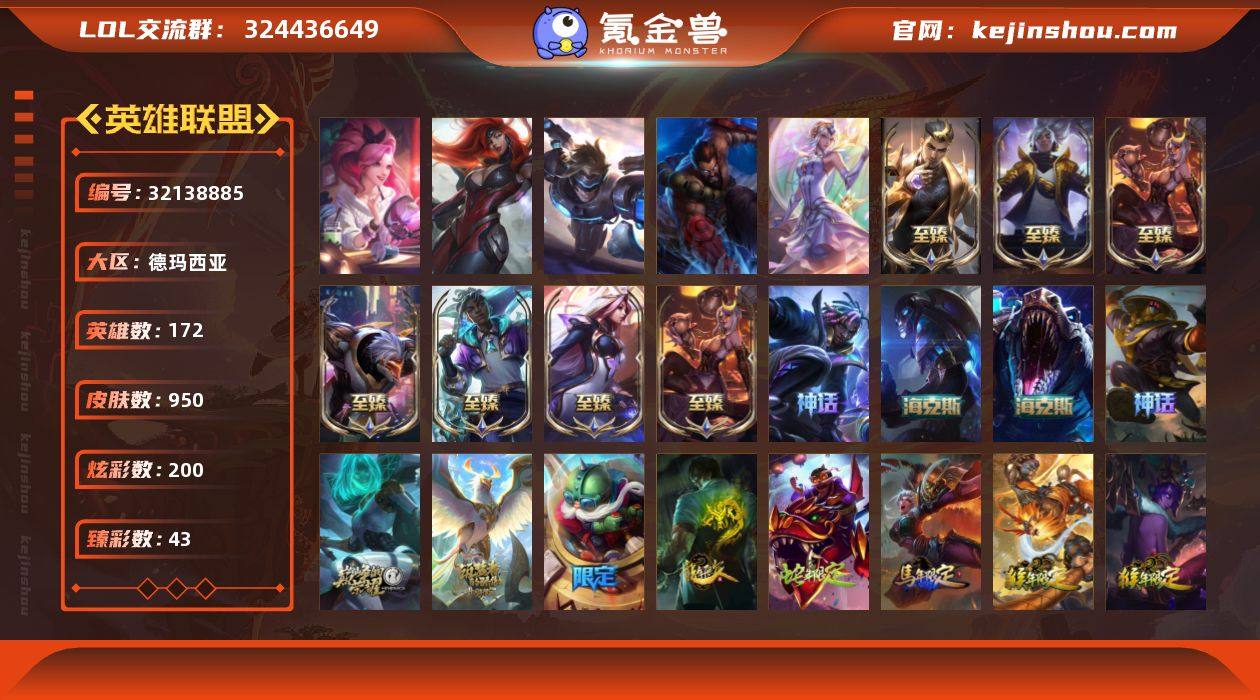 950皮。 龙瞎带一张炫彩。奥斯曼大帝。艾克神话。贾克斯神话。终极5皮 限定202。传说88。 炫彩200。臻彩43。