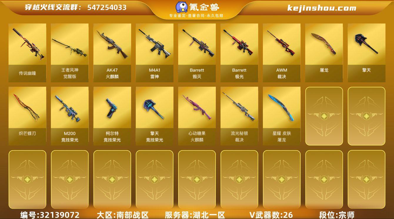 湖北一区-27V-2王者武器数-0炫金武器数 【传说武器】:传说幽瞳 【热门武器】:传说幽瞳,M200-竞技荣光,裁决-雪莉杨,炽芒蝶刃 【音效卡】:Barrett-极光音效卡 【皮肤】:裁决-流光秘银,火麒麟-心动糖果,毁灭-神秘黑洞皮肤,极光-能量核心,屠龙-星耀 皮肤,屠龙-惊鸿 皮肤 【角色】:乔伊教练,修道士,暗夜-X,初恋灵狐,兰-新年限定,兰妹妹,灵狐者-七夕宝贝,潘多拉-X,铁骑荣耀,兔囡囡,维纳斯,樱-战斗天使 【人偶武器】:裁决-雪莉杨,深渊终结者手雷,灵狐娃娃手雷 【挑战大师】:冰龙粉碎者-白马银枪 【英雄级武器】:AK47-火麒麟,M4A1-雷神,Barrett-毁灭,Barrett-极光,AWM-裁决*3,M200-竞技荣光,王者风神-觉醒版,柯尔特-竞技荣光,屠龙*5,擎天,擎天-竞技荣光,炽芒蝶刃,高爆手雷-竞技荣光*2,闪光弹-竞技荣光*3,闪光弹-雷暴王者,烟雾弹-竞技荣光*2 【道具】:云山科技背包,云海游龙炫彩背包,炫彩背包,虎牙炫彩背包,绿色巨人,灵魂忍者,迷雾幽灵,夺命之镰,防化服*3,金色流光-枪王排位,枪王排位28赛季金色流光,枪王排位29赛季金色流光,电玩兔兔表情,EP战队名片,防弹头盔*4,防弹衣*4,C4工具钳*4,手雷包*4 【特殊枪械】: