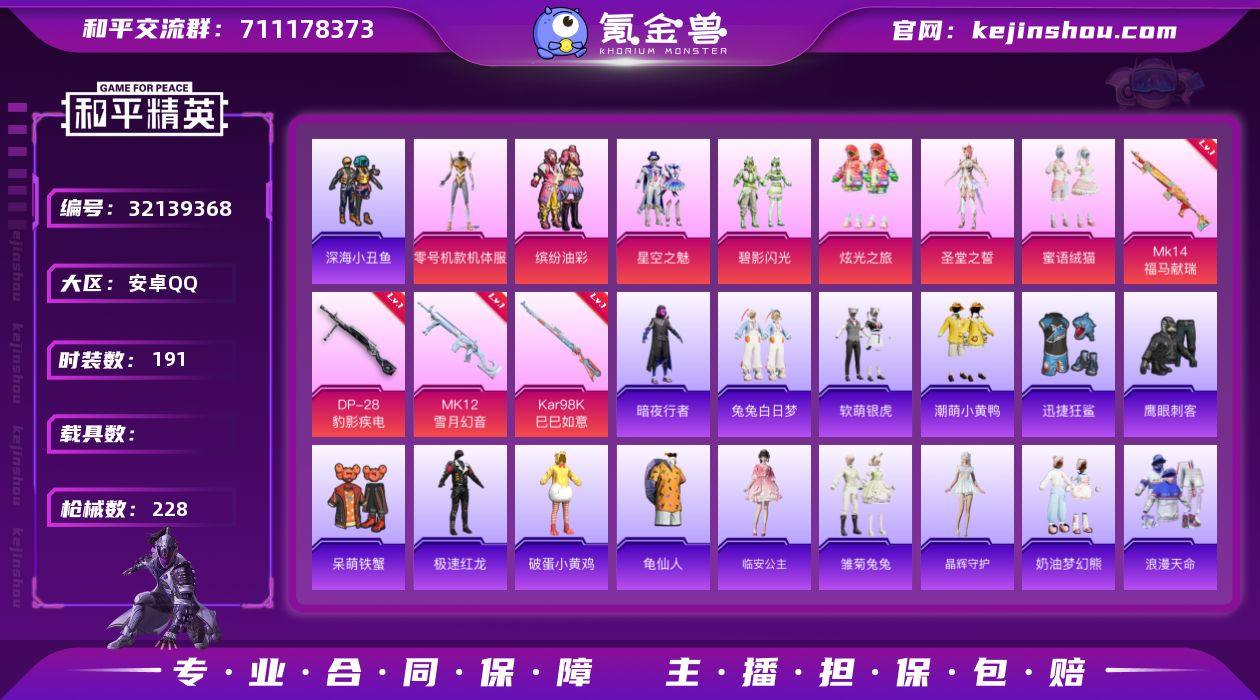 DYH18038【7粉装-4特效枪 猪脸 黄螳螂 深海小丑鱼 小丑鱼 迅捷狂鲨 浪漫天命】安卓手Q-7粉装-4特效枪-191套装-228枪皮-16王牌印记-荣耀皇冠Ⅰ-73429热力值【7粉装】蜜语绒猫,角色-圣堂之誓,星空之魅,炫光之旅,碧影闪光,缤纷油彩,角色-零号机款机体服【4特效枪】DP-28-豹影疾电[5级],Mk14-福马献瑞[1级],12-雪月幻音[7级],Kar98K-巳巳如意[5级]【3稀有】浪漫天命,小丑鱼,深海小丑鱼【12飞行器】马上有福飞行器,梦幻童话飞行器,顶峰精英尾迹,登顶巅峰飞行器,云朵驼驼飞行器,火焰蝠人飞行服,炫彩糖果飞行器,粉色滑翔尾迹,空岛之星尾迹,光之冒险尾迹,狂鲨锋刃飞行器,异域银装飞行器【1头盔】深海小丑鱼头盔【1背包】深海小丑鱼背包【405其它衣服和枪皮】纯真浪花,曼妙人鱼,极乐追光,鱼渊荷华,魅力单车,半糖蓝莓,银月精灵,春光漫游,锦衣飞扬,SS27特训,暗夜行者,牛仔情诗,异彩先驱,耀眼新星,绮丽涂鸦,龙魂突击队,空岛之星,幻影武者,青年教官,春日漫步,冰河战士,角色-薰款战斗服,软萌银虎,雏菊兔兔,红色运动,SS29特训,狙击之神,青翼流星,朱霞炽焰,牛气冲天,星渊小夜曲,漫步者,完美偶像,幻世战舞者,和煦暖阳,炫彩糖果,长空猛禽,绯红恋人,SS26特训,SS31特训,街头潮人,蓝冰羽,潮流炫酷,角色-绯色魅影,燕燕于飞,飞行日记,霓虹街区,田园牧歌,凌霄紫焰,秘语星愿,恋恋初桃,龟仙人,SS25特训,雪晶战甲,SS18特训,娇憨猪猪,风迹短诗,午间小调,角色-情公主,顶瓜瓜,SS36特训,晶辉守护,雪国风尚,海盐绵绵冰,狂鲨锋刃,SS19特训,SS32特训,顽皮玉兔,智慧之神,黄色运动,骑行爱好者,深蓝色名流,角色-临安公主,SS33特训,破蛋小黄鸡,音速流光,SS21特训,老实芭蕉,冰冻风暴,SS28特训,创世·幻影,蓝彩潮人,缤纷果语,霓虹极客,马上来财,海岛探路者,蓝色运动,惊鸿侠骨,白糯汤圆,灼焰舞者,星途旅人,猎鹰,SS37特训,缤纷焰火,角色-明日香款战斗服,元气之...