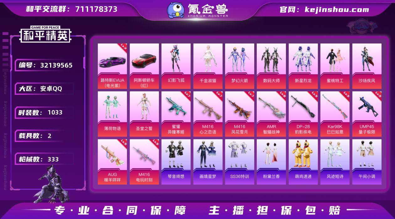 2载具-275套装-333枪皮--2稀有2载具9粉装12特效枪35热门275套装333枪皮 热力值 23印记 历史传奇王牌14星 【2稀有】 巡查衣 浪漫天命 【2载具】 路特斯EV紫色 (3级) 阿斯顿马丁S红色 【9粉装】 圣堂之誓 梦幻火箭 千金淑猫 幻影飞狐 数码大师 新星烈龙 蜜桃特工 薄荷物语 沙场疾风 【12特效枪】 M416-心之恋语 (7级) M416-电玩时刻 (5级) AKS-74U-森灵之息 (5级) Kar98K-巳巳如意 (5级) DP-28-豹影疾电 (5级) AUG-暖羊咩咩 (5级) 蜜獾-异瞳寒姬 (7级) UMP45-量子极限 (5级) AMR-智耀战神 (6级) M416-风花雪月 (7级) AKS-74U-森灵之息 (5级) ACE32-萌骑漫游 (4级) 【35热门】 龟仙人 浪漫假日 仓鼠灰灰 潮萌小黄鸭 梦魇先生 鹰眼刺客 软萌银虎 兔兔白日梦 激萌罗小黑 暴走罗小黑 浪漫波比 金羽特工 TJB追光队服 NV战队服 TJB战队服 TT战队服 暗夜契约 暗影哥特 赛罗奥特曼 团圆交子 瑞龙福将 纯白誓言 粉红小猪 狂沙舞者 漫步者 蓝甜马卡龙 安第斯皇冠 机械英豪 风华少年志 白月香洋装 极速红龙 英勇保护者 M762-瑞龙福将 M249-古堡领主 Kar98K-古堡领主 【1飞行器】 梦幻火箭飞行器 【4头盔】 梦幻火箭头盔 甜心宝贝头盔 幻影战神头盔 深海小丑鱼头盔 【6背包】 梦幻火箭背包 甜心宝贝背包 萌熊伴侣背包 神秘黑猫背包 古堡领主背包 甜蜜誓约背包 营地ID: