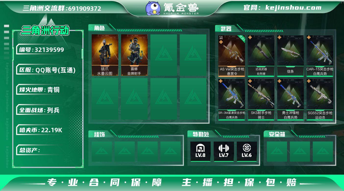 【特价出售】" 总资产171.7M,哈夫币 22196.7K,战场等级:5 列兵,行动等级:60 三角洲巅峰,角色皮肤2,枪皮数量63【特战干员外观】骇爪-水墨云图,露娜-金牌射手,【近战】近战-信条,近战-处刑者,近战-黑鹰,【典藏外观】AS Val突击步枪-悬赏令(优品S),AK-12突击步枪-极地勘察队,SMG-45冲锋枪-蝴蝶,SG552突击步枪-彩墨涂鸦,【步枪】AKM突击步枪-锦绣,QBZ95-1突击步枪-凌霄戍卫,K416突击步枪-行动记录,腾龙突击步枪-马年祥瑞,K437突击步枪-锦绣,SG552突击步枪-运动员,SCAR-H战斗步枪-水墨云图,CAR-15突击步枪-白鹰兵势,QBZ95-1突击步枪-曙光,AUG突击步枪-蝮蛇,SCAR-H战斗步枪-荣耀列队,M4A1突击步枪-海色,QBZ95-1突击步枪-海色,PTR-32突击步枪-黄蜂,SG552突击步枪-海浪,QBZ95-1突击步枪-海浪,SCAR-H战斗步枪-数码迷彩,M4A1突击步枪-粉色涂装,M16A4突击步枪-三角洲力量,SCAR-H战斗步枪-红色涂装,M7战斗步枪-红色涂装,AUG突击步枪-浅蓝涂装,SG552突击步枪-浅蓝涂装,K416突击步枪-几何迷彩,K416突击步枪-高雅黑,M4A1突击步枪-高雅黑,QBZ95-1突击步枪-高雅黑,G3战斗步枪-高雅黑,【狙击步枪/射手步枪】M14射手步枪-缄花,SR-25射手步枪-缄花,SKS射手步枪-骑士,SR-25射手步枪-信条,SR-25射手步枪-开拓,SKS射手步枪-弄臣,Mini-14射手步枪-荣耀列队,SR-25射手步枪-黄蜂,SV-98狙击步枪-红色涂装,【冲锋枪】MP7冲锋枪-六套之力,SMG-45冲锋枪-锦绣,SR-3M紧凑突击步枪-白鹰兵势,勇士冲锋枪-能天使·午夜邮差,P90冲锋枪-信条,勇士冲锋枪-白鹰兵势,Vector冲锋枪-先锋,MP5冲锋枪-弄臣,SMG-45冲锋枪-行动开启,SMG-45冲锋枪-幻影结构,QCQ171冲锋枪-三角洲力量,Vector冲锋枪-几何迷彩,MP5冲锋枪-海色,UZI冲锋枪-海色,MP5冲锋枪-黄蜂,【轻机枪/霰弹枪】PKM通用机枪-蝮蛇,M1...