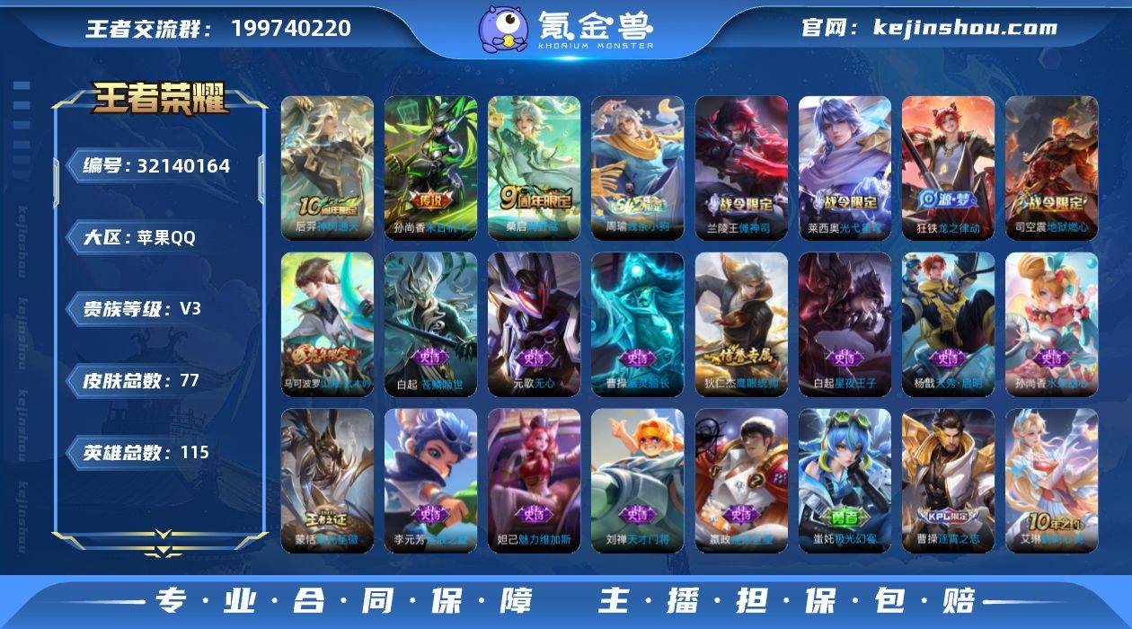 苹果Q-V3-至尊星耀III段位-115英雄-77皮肤-3传说-17史诗【传说皮肤】:后羿神树通天,桑启鸣野蒿,孙尚香末日机甲【限定皮肤】:狄仁杰阴阳师,元歌无心,马可波罗山海玄木吟,项羽海滩派对,李元芳云中旅人,钟馗驱傩正仪,桑启海盐诗旅,司空震地狱燃心,张良古海寻踪,蒙恬荣光圣徽,鬼谷子天穹祈灯,刘邦剑破天穹【年限皮肤】:马可波罗山海玄木吟【赛季限定】:钟馗驱傩正仪,李元芳云中旅人,桑启海盐诗旅,张良古海寻踪,鬼谷子天穹祈灯,刘邦剑破天穹,钟馗虚灵犬护,亚瑟荣光之誓,蒙恬荣光圣徽【战令限定】:司空震地狱燃心,兰陵王傩神司,莱西奥光弋星穹,明世隐往忆晖光,周瑜线条小狗【史诗皮肤】:周瑜线条小狗,兰陵王傩神司,莱西奥光弋星穹,狂铁龙之律动,白起苍鳞隐世,蒙恬荣光圣徽,司空震地狱燃心,马可波罗山海玄木吟,元歌无心,杨戬天秀启明,狄仁杰鹰眼统帅,白起星夜王子,李元芳逐浪之夏,刘禅天才门将,曹操幽灵船长,妲己魅力维加斯,嬴政摇滚巨星,孙尚香水果甜心【其他皮肤】:蚩奼极光幻客,曹操逐霄之志,艾琳鹤鸣心笺,明世隐往忆晖光,亚瑟荣光之誓,张良灵野札记,苏烈春野闲踪,钟馗虚灵犬护,刘邦剑破天穹,廉颇功夫炙烤,海诺时空谍影,鬼谷子天穹祈灯,后羿完美运算,亚连破局者,张良古海寻踪,李元芳妄想特派,姬小满零食大作战,白起乐园追猎者,桑启海盐诗旅,戈娅危途狂花,李元芳云中旅人,钟馗驱傩正仪,孙尚香沉稳之力,老夫子功夫老勺,狂铁命运角斗场,刘备纽约教父,狄仁杰阴阳师,宫本武藏万象初新,花木兰兔女郎,达摩拳王,亚瑟死亡骑士,孙膑天使之翼,程咬金星际陆战队,赵云白执事,露娜哥特玫瑰,韩信街头霸王,项羽海滩派对,司空震启蛰,马超幸存者,李信灼热之刃,伽罗花见巫女,孙策海之征途,元歌午夜歌剧院,公孙离花间舞,百里守约绝影神枪,...