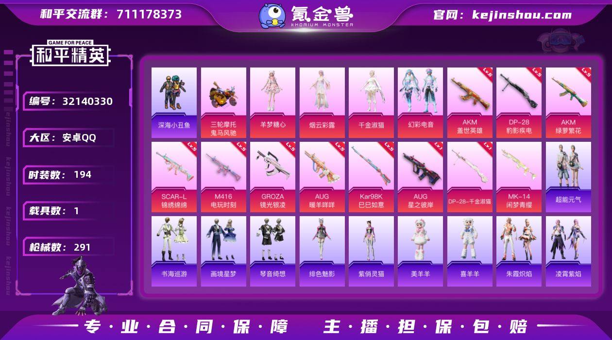 安卓 手Q-4粉装-14特效枪-1载具-9粉色飞行器-82055热力值-11王牌印记-194套装-291枪皮 【热门品类】:套装-深海小丑鱼,套装-小丑鱼,套装-龟仙人,套装-暗影哥特,角色-8号机,角色-Mark.06 【粉色套装】:角色-烟云彩露,角色-千金淑猫,粉装-幻彩电音,角色-羊梦糖心 【粉色枪皮等级】:AKM-盖世英雄(六级),AKM-绿萝繁花(五级),SCAR-L-锦绣绵绵(五级),M416-电玩时刻(五级),GROZA-镜光银凌(五级),AUG-星之彼岸(一级),AUG-暖羊咩咩(五级),AUG-罪夜之冕(六级),UMP45-萌骑冒险(二级),Kar98K-巳巳如意(五级),Mk14-福马献瑞(四级),DP-28-千金淑猫(一级),DP-28-豹影疾电(五级) 【粉色载具】:鬼马风驰 【粉色枪皮】:AKM-盖世英雄,AKM-绿萝繁花,SCAR-L-锦绣绵绵,M416-电玩时刻,GROZA-镜光银凌,AUG-星之彼岸,AUG-暖羊咩咩,AUG-罪夜之冕,UMP45-萌骑冒险,Kar98K-巳巳如意,Mk14-闲梦青缨,Mk14-福马献瑞,DP-28-千金淑猫,DP-28-豹影疾电 【粉色飞行器】:炫彩糖果飞行器,天之羽翼飞行器,镜光幻境飞行翼,繁龙极客飞行器,绝色倾城飞行器,霓虹漫游飞行器,灵珠游龙飞行器,极意拳锋飞行器,暮色之舞飞行器 【粉色降落伞】:绝对恒星降落伞,梦幻火箭降落伞,星之彼岸降落伞,齐天大圣降落伞,恐龙拽拽降落伞,千面幻镜降落伞,歌者泠鸢降落伞,暗夜鎏金降落伞,圣堂之誓降落伞,江南烟雨降落伞,精灵梦叶罗丽降落伞,金丰海韵降落伞,忍者神龟降落伞,英伦信使降落伞,千金淑猫降落伞,樱桃泡泡降落伞,星穹咏叹调降落伞,冷漠罗丽降落伞,绯穹魔姬降落伞,喜羊羊与灰太狼降落伞,异瞳寒姬降落伞,炫彩糖果降落伞 【稀有套装】:套装-龟仙人,套装-巳巳如意,套装-小鸟芋圆,套装-超能元气,套装-红色流星,套装-雪国风尚,套装-炫彩糖果,套装-马上来财,套装-雏菊兔兔,套装-萝兰蝴蝶,角色-米...