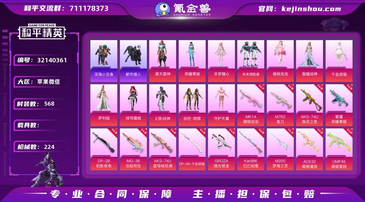 YM9436双字ID:员仓/ROCK上衣 都市 东方飞龙/狂沙舞者 战队服 深海小丑鱼 梦海之灵 🈵樱桃泡泡 鬼刀千金淑猫 异瞳寒姬 星穹咏叹调 14特效12粉装142紫装 特权卡324天 大转盘84 地铁34天赋实名: 可修改 时装数: 568 枪械数: 224 战备数: 185 热门装扮: 幻影战神,呆萌铁蟹,深海小丑鱼,鹰眼刺客,都市猎人,东方飞龙,创世·救赎,守护天翼,未来领航者,千金淑猫,萨利娅,樱桃泡泡,智耀战神,绯穹魔姬,羊梦糖心,异瞳寒姬,震天雷神 稀有枪皮: M200梦海之灵,DP-28-千金淑猫,GROZA-镜光银凌,Kar98K-巳巳如意,M762-鬼刀,MK14-樱桃泡泡,AKS-74U-星穹咏叹调,DP-28-豹影疾电,MG-36-沧焰双生,蜜獾-异瞳寒姬,AKS-74U-森灵之息,ACE32-萌骑漫游,UMP45-萌骑冒险