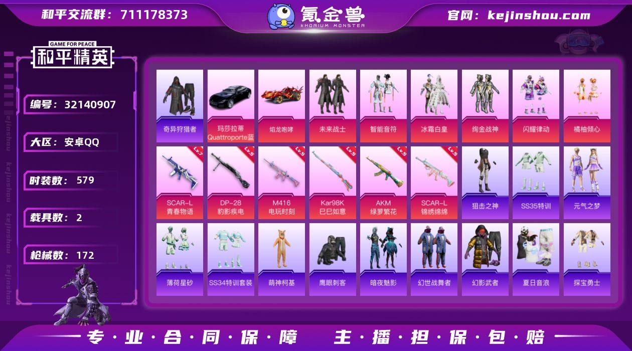 【主播推荐】实名: 不可修改 时装数: 579 载具数: 2 枪械数: 172 战备数: 115 热门装扮: 奇异狩猎者,未来战士,鹰眼刺客,智能音符,绚金战神,冰霜白皇,闪耀律动,橘柚倾心,萌神柯基,暗夜魅影 载具: 焰龙咆哮,玛莎拉蒂Quattroporte(夜幕蓝) 稀有枪皮: SCAR-L青春物语,AKM绿萝繁花,SCAR-L-锦绣绵绵,M416电玩时刻,Kar98K-巳巳如意,DP-28-豹影疾电