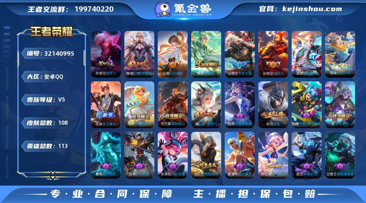 安卓Q-V5-最强王者段位-113英雄-108皮肤-6传说-26史诗【英雄全皮】:刘禅全皮【传说皮肤】:云缨幻光神枪,桑启鸣野蒿,亚瑟追逃游戏,孙悟空齐天大圣,李信山海炽霜斩,孙悟空地狱火【限定皮肤】:狄仁杰阴阳师,赵云皇家上将,赵云龙胆,高渐离玩趣恶龙,狄仁杰魔术师,项羽海滩派对,亚瑟追逃游戏,孙悟空齐天大圣,裴擒虎擒涛扼浪,瑶山海碧波行,李信山海炽霜斩,嫦娥暖冬兔眠,鲁班大师探海日志,桑启海盐诗旅,暃星界游侠,艾琳流音漫舞,司空震地狱燃心,阿古朵江河有灵,张良古海寻踪,蒙恬荣光圣徽,鬼谷子天穹祈灯,沈梦溪龙舞盛年,程咬金群星魔术团【年限皮肤】:李信山海炽霜斩,瑶山海碧波行【赛季限定】:桑启海盐诗旅,裴擒虎擒涛扼浪,鲁班大师探海日志,张良古海寻踪,鬼谷子天穹祈灯,太乙真人谧流熔炉,钟馗虚灵犬护,甄姬逆浪荇歌,亚瑟荣光之誓,蒙恬荣光圣徽【战令限定】:暃星界游侠,嫦娥暖冬兔眠,司空震地狱燃心,艾琳流音漫舞,刘禅鸭鸭历险记,沈梦溪鸭鸭历险记,周瑜线条小狗【史诗皮肤】:周瑜线条小狗,狂铁龙之律动,刘禅鸭鸭历险记,蒙恬荣光圣徽,阿古朵江河有灵,司空震地狱燃心,刘禅电玩爆裂旋风,蔡文姬电玩兔顽号,瑶山海碧波行,暃星界游侠,赵云龙胆,狄仁杰鹰眼统帅,刘禅天才门将,安琪拉心灵骇客,亚瑟心灵战警,兰陵王暗隐猎兽者,夏侯惇乘风破浪,吕布末日机甲,曹操幽灵船长,刘禅绅士熊喵,妲己魅力维加斯,孙尚香水果甜心,廉颇地狱岩魂,狄仁杰魔术师,甄姬冰雪圆舞曲,赵云未来纪元,赵云皇家上将【其他皮肤】:蚩奼极光幻客,亚瑟荣光之誓,莱西奥踏浪烽翎,甄姬逆浪荇歌,白起死霸装,姬小满小满鸭,露娜命运加冕,张良灵野札记,沈梦溪鸭鸭历险记,钟馗虚灵犬护,达摩爆裂喵拳,典韦铁骨偃魂,太乙真人谧流熔炉,苍苍林狼骑,干将莫邪雾都夜雨,程咬金群...