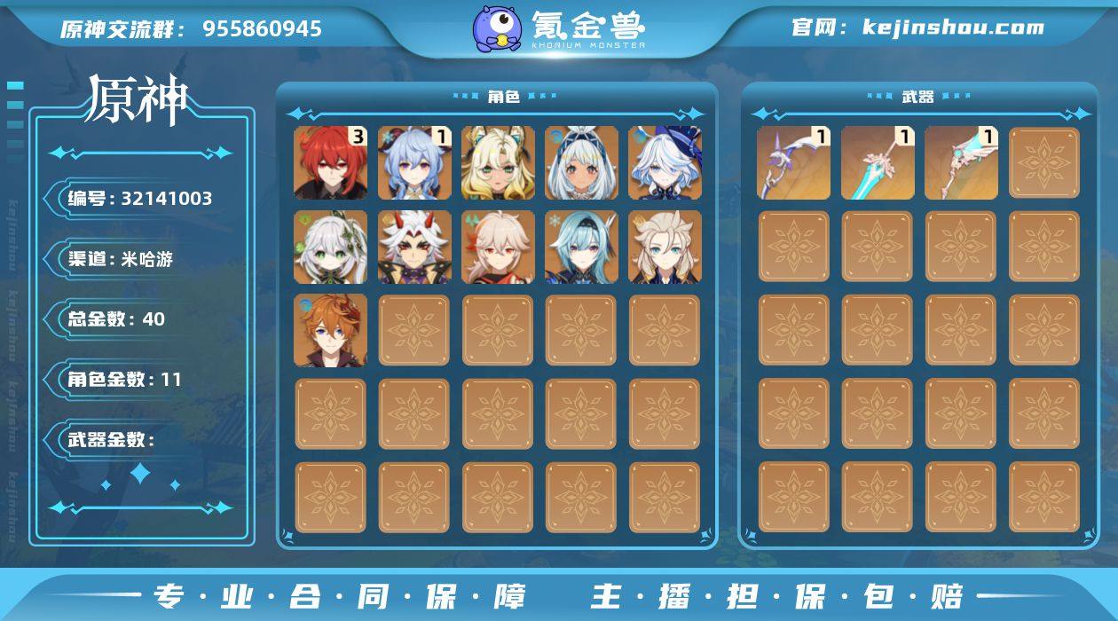 40黄 风元素:0命枫原万叶, 0命温迪 水元素:0命芙宁娜, 0命达达利亚, 0命玛拉妮, 0命哥伦比娅 雷元素:0命菲林斯, 1命雷电将军 冰元素:1命甘雨, 0命优菈, 0命埃洛伊 岩元素:0命希诺宁, 0命荒泷一斗, 0命阿贝多, 0命钟离 草元素:0命纳西妲 【常驻五星角色及命座】 风元素:2命琴 火元素:3命迪卢克, 0命迪希雅 水元素:0命莫娜 雷元素:5命刻晴 冰元素:0命七七 双手剑:精1天空之傲, 精1赤角石溃杵 长柄武器:精1护摩之杖 法器:精1天空之卷 弓:精1天空之翼, 精1阿莫斯之弓 【角色皮肤】 五星角色:迪卢克-殷红终夜 四星角色:菲谢尔-极夜真梦, 绮良良-倩影游侠, 香菱-岁夜欢哗, 凝光-纱中幽兰