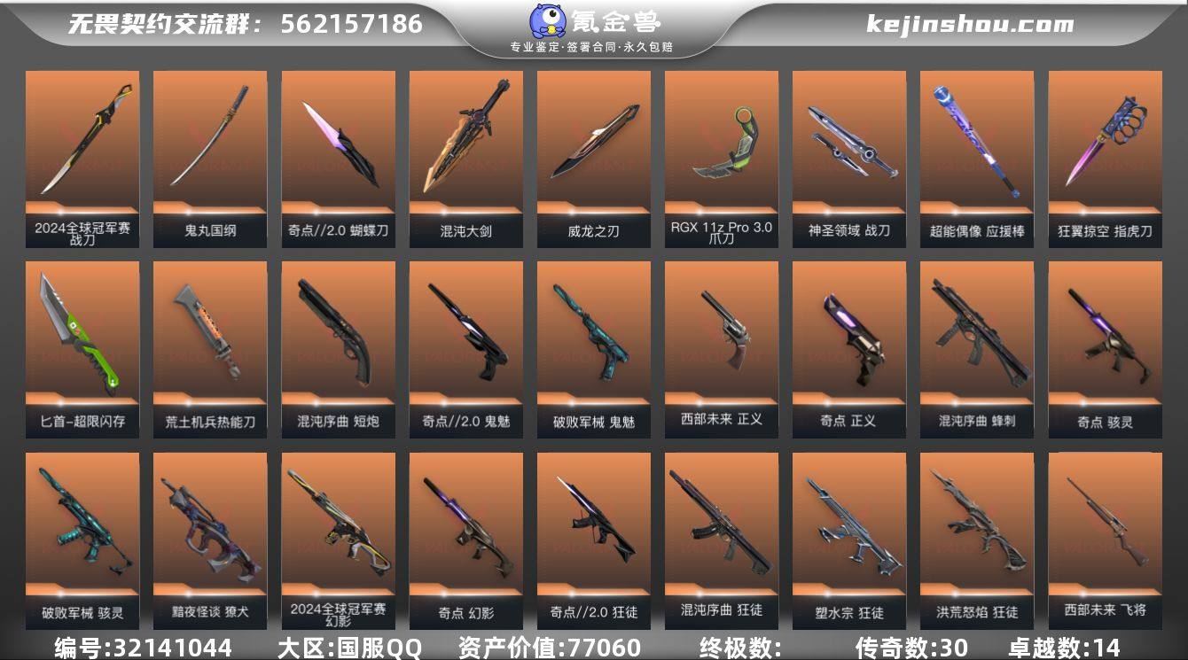 皮肤资产价值:77060 已用源晶点数:1210 威龙之刃-耀鳞威龙,匕首-超限闪存,狂翼掠空指虎刀 爪刀-RGX 11z Pro 3.0 战刀-2024全球冠军赛,鬼丸国纲-般若假面//2.0,混沌大剑-混沌序曲,荒土机兵热能刀,神圣领域 战刀 超能偶像 应援棒 蝴蝶刀-奇点//2.0 獠犬-黯夜怪谈,幻影-2024全球冠军赛,幻影-奇点,狂徒-奇点//2.0,狂徒-混沌序曲,狂徒-塑水宗,狂徒-洪荒怒焰,獠犬-般若假面//2.0,獠犬-赛博迷城,戍卫-掠影,狂徒-盖亚的复仇,狂徒-紫阙金琅,狂徒-般若假面//2.0,幻影-超限闪存,幻影-聚合之力,幻影-纳米打击,幻影-神圣领域,狂徒-超能偶像,狂徒-荒土机兵,狂徒-狂翼掠空,狂徒-永恒之砂,獠犬-采蜜小蜂队,獠犬-模拟赫兹,獠犬-神圣领域,戍卫-超能偶像,戍卫-浮光跃金,戍卫-琉璃幻梦,戍卫-逆冲蛮牛,戍卫-月球哨兵 蜂刺-混沌序曲,骇灵-奇点,骇灵-破败军械,骇灵-堕天遗武,蜂刺-聚合之力,蜂刺-超限闪存,骇灵-浮光跃金,骇灵-荒土机兵,骇灵-星云暗涌 战神-奇点,战神-般若假面//2.0,战神-盖世英雄,奥丁-紫阙金琅2.0,奥丁-狂翼掠空,奥丁-纳米打击,战神-采蜜小蜂队,战神-浮光跃金,战神-神圣领域 飞将-西部未来,冥驹-偃月苍龙,冥驹-混沌序曲,飞将-聚合之力,冥驹-荒土机兵,冥驹-模拟赫兹,莽侠-超限闪存,莽侠-月球哨兵 短炮-混沌序曲,鬼魅-奇点//2.0,鬼魅-破败军械,西部未来 正义,正义-奇点,标配-源能者危机001,狂怒-般若假面//2.0,正义-猩红猛兽,标配-阿特拉斯指挥部,标配-超能偶像,标配-浮光跃金,标配-荒土机兵,鬼魅-采蜜小蜂队,鬼魅-诡秘蛇影,鬼魅-模拟赫兹,鬼魅-星云暗涌,狂怒-聚合之力,狂怒-逆冲蛮牛,狂怒-神圣领域,正义-传奇制造,正义-超限闪存,正义-狂翼掠空,正义-纳米打击,正义-日耀风暴,正义-月球哨兵 雄鹿-紫阙金琅2.0,判官-采蜜小蜂队,判官-超能偶像,判官-纳米打击,雄鹿-狂翼掠空,雄鹿-模拟赫兹,雄鹿-逆冲蛮牛,雄鹿-月球哨兵 般若假面2.0卡面,采蜜小峰队卡面,超能偶像卡面,分崩离析卡面,复活专家卡面,无畏契约GO!第三卷 幽影卡面,无畏契约GO!第一卷:零卡面,无畏契约GO!第一卷:芮娜卡面,钢锁工牌卡面,归乡蝰蛇卡面,聚合之力卡面,梦幻奶茶卡面,奇点2.0卡面,2024全球冠军赛卡面,势不可挡星礈卡面,双城之战拥抱卡面,失而复得卡面,声感陷阱设计图卡面,生意人麦宝卡面,铁之华卡面,万圣夜卡面,无垠星环卡面,最高舞台卡面,战术小伙伴的夏日卡面