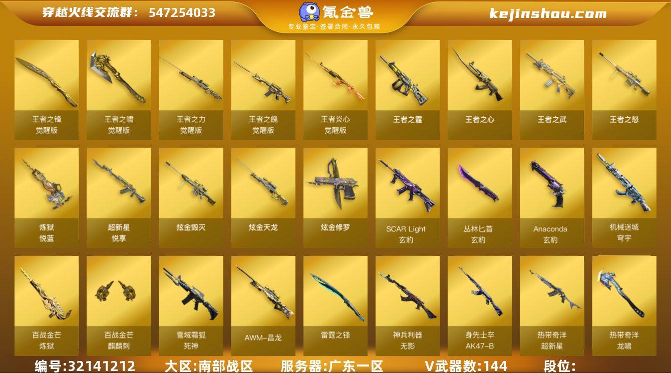 南部战区(广东一区)lb【生化爆破挑战三全号】传说【传说暗裔】144v【M200-幻神+双皮(AG-CFPLS24冠军+黄忠),Kar98k-星神,5黑骑士,玄豹套装,雷暴套装,武圣套装,热带奇洋套装,ScarLight-白虎,HK417-朱雀,QBZ03-金色蔷薇,AWM-裁决+皮/运输船,6盘龙+6烈龙+斯泰尔-蝴蝶,USP-雷暴,COP-堕天神,Anaconda-玄豹,异变清道夫-蛇影双骄 ,QBZ03-吕布,街机小灰机,猫猫手套】13王者【王者之霆,王者炎心,王者之心,王者之魄,王者之武,王者之力,王者之怒,王者之锋,王者之啸,炼狱-悦蓝】6炫金【炫金武士,炫金骑士,炫金毁灭,炫金天龙,炫金修罗】12角色【四防玄豹,迷迭香,樱,炫,魅影,零·纪元,战地猎狐,葵-阿尔法武装,奇洋探员,王者-零,修道士,雪域霜狐,职业选手,雅典娜】6音效【M4A1-雷神音效卡,M4A1-黑骑士音效卡,Barrett-毁灭音效卡,Barrett-碧霄极光音效卡,炼狱-百战金芒-庆典舞曲音效卡,死神-雪域霜狐-怀旧音效卡】37皮【幻神-AG-CFPLS24冠军,幻神-黄忠,裁决-运输船,火麒麟-白虎,毁灭-星空,毁灭-虹光风暴,雷神-星空,火麒麟-巅峰荣耀,屠龙-惊鸿,毁灭-AG-CFPLS15冠军,烈龙-星空,毁灭-战神张飞,毁灭-CFS2018,火麒麟-心动糖果,毁灭-荣耀之怒,雷神-白鲨-CFPLS14冠军,火麒麟-轻羽,火麒麟-AG战队,雷神-荣耀之魄】挑战枪【火狱乱世-超越MAX,地狱征服者-超越MAX,毁灭征服者-超越MAX,封神放逐者III,试炼破坏者III】【VIP6】 截图展示段位不代表实际段位 如赛季更新等不可抗拒因素发生变化、时限道具不保证所剩时间