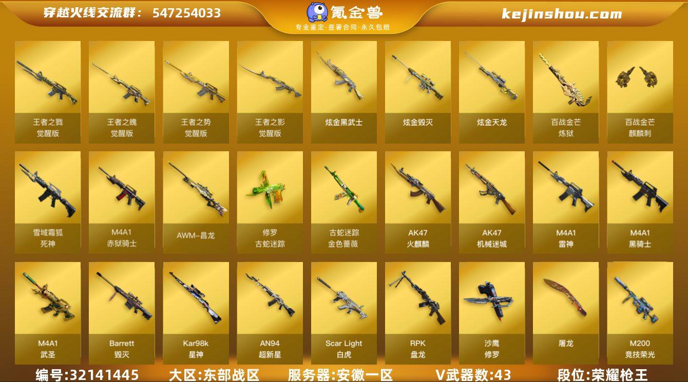 安徽一区-48V-5王者-4炫金 【热门武器】:Scar Light-白虎,金色蔷薇-古蛇迷踪,修罗-古蛇迷踪,M200-竞技荣光,Kar98K-星神,M4A1-黑骑士*2,RPK-盘龙,金色蔷薇-空,羊驼玩偶,裁决-雪莉杨,USP-雷暴,沙鹰-修罗*2 【王者炫金武器】:炫金武士,炫金毁灭*2,炫金天龙,王者之魄闪光弹 【音效卡】:M4A1-黑骑士音效卡,Barrett-极光音效卡,Barrett-碧霄极光音效卡,炼狱-百战金芒-庆典舞曲音效卡,死神-雪域霜狐-怀旧音效卡,AWM-昌龙-怀旧音效卡 【皮肤】:ScarLight-白虎-冠军之虎皮肤,白虎-百战金芒 皮肤,雷神-暗月,雷神-能量核心,雷神-虎将,M4A1-再燃火线,雷神-神秘按键 皮肤,火麒麟-雷神,火麒麟-白虎,毁灭-暗月,毁灭-风暴,毁灭-英雄计划 皮肤,黑骑士-暗月,黑骑士-地狱火,黑骑士-伏羲,战神-流金岁月皮肤,AK47-B-常胜将军-刘备,修罗耀金皮肤,轻型军用手斧-再燃火线 【角色】:葵,电竞教官-云悠悠,战地猎狐,雪域霜狐,蛇隐宗,乔伊教练,暗夜-X,北极狐-X,风暴女,娟娟,0号玩家,灵动武士,龙儿,潘多拉-甜心教官,蛇姬,斯沃特-X 【人偶武器】:裁决-雪莉杨,天龙-曼陀罗,金色蔷薇-空,AWM-灵狐-15周年嘉年华*2,迷你深渊冰龙,生化手雷-机甲核心 【暴走生化】:超级对讲机 【挑战大师】:冰龙粉碎者-白马银枪,神圣爆裂者-末日III 【英雄级武器】:AK47-火麒麟,M4A1-雷神,M4A1-黑骑士*2,AN94-超新星,M4A1-武圣*3,AK47-机械迷城,Scar Light-白虎,金色蔷薇-古蛇迷踪,死神-雪域霜狐,王者之影-觉醒版,王者之魄-觉醒版,王者之势-觉醒版,王者之戮-觉醒版,Barrett-毁灭,Kar98K-星神,M200-竞技荣光,Barrett-金色蔷薇,RPK-盘龙,炼狱-百战金芒,沙鹰-修罗*2,USP-雷暴,柯尔特-竞技荣光,修罗-古蛇迷踪,屠龙,擎天-竞技荣光*2,擎天-云海游龙,麒麟刺-百战金芒,高爆手雷-...