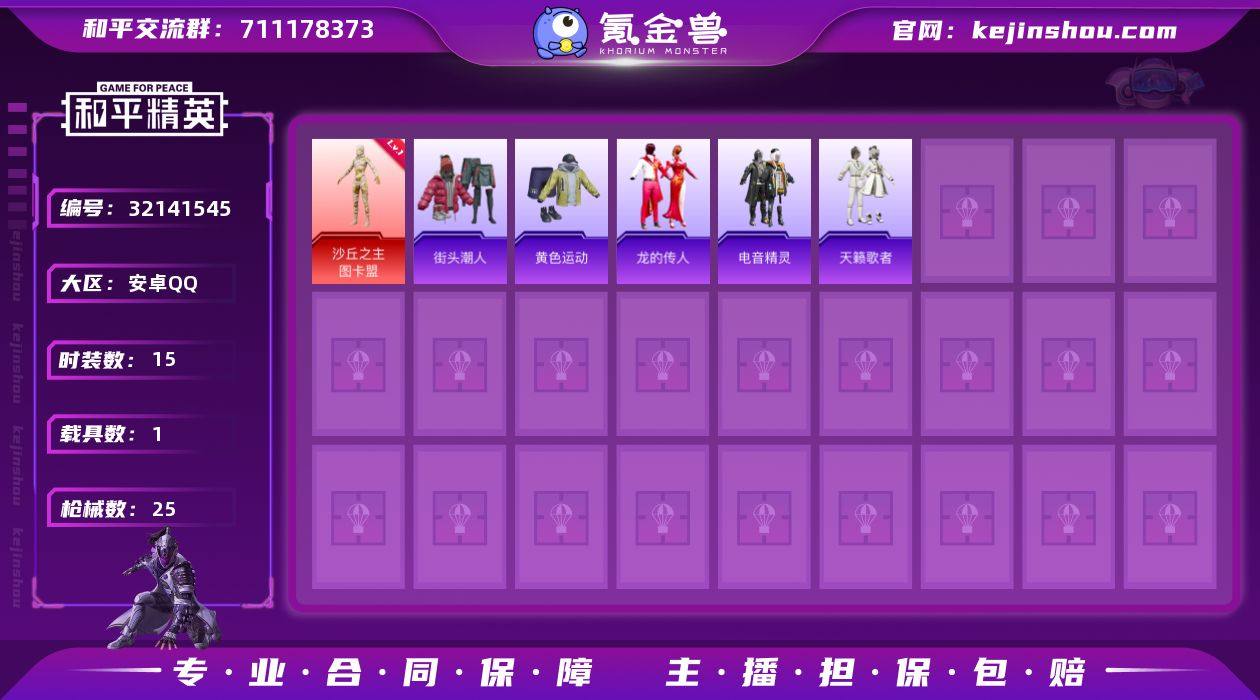 安卓 手Q-1神装-0粉装-3特效枪-1载具-1粉色飞行器-9080热力值-1王牌印记-15套装-25枪皮 【红色神装等级】:沙丘之主-图卡盟(一级) 【红色角色神装】:沙丘之主-图卡盟 【粉色枪皮等级】:UMP45-萌骑冒险(一级),AKS-74U-森灵之息(五级),Mk14-福马献瑞(五级) 【粉色载具】:凌风神骏 【粉色枪皮】:UMP45-萌骑冒险,AKS-74U-森灵之息,Mk14-福马献瑞 【粉色飞行器】:踏卷乘风飞行器 【粉色降落伞】:洛神天依降落伞,星梦奇缘降落伞,天马神君降落伞 【稀有套装】:套装-马上有钱,套装-雨过天青,套装-红釉青花 【稀有枪皮】:M416-糯团青竹,AUG-耀粉歌者,QBZ-洛神天依,Mk47-洛神天依,蜜獾-天降萌叽,ARX-天马神君,MP5K-天马神君,Kar98K-洛神天依,M24-炫彩节奏,AWM-雷霆特警,Mini14-天马神君 【其他套装】:套装-街头潮人,套装-黄色运动,套装-龙的传人,套装-电音精灵,套装-天籁歌者 【营地ID】:1044257144