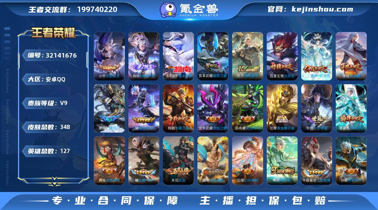 【精品贵族9·韩信群星魔术团·怪盗基德·天鹅之梦·愿照众生和·霜北刀·逐花归海·遇见神鼓·碎云·时雨天司·武圣·一念神魔·白虎志·永曜之星·凤求凰·可二次】YXw17472-安卓Q-127英雄-348皮肤-4王者印记-300铭文-贵族积分10w【贵族9】【1典藏·1无双·1珍品·1星传说·27传说·26按键·256幸运值】【因赛季更新游戏段付以上号为准!】 【英雄全皮】:刘邦全皮,孙权全皮,影全皮 【荣耀典藏】:小乔天鹅之梦 【无双皮肤】:韩信群星魔术团 【珍品传说】:马可波罗怪盗基德 【传说皮肤】:后羿神树通天,妲己愿照众生和,云缨幻光神枪,桑启鸣野蒿,夏侯惇霜北刀,典韦战鼓燎原,澜逐花归海,吕布遇见神鼓,百里守约碎云,后羿无尽星芒,孙策末日机甲,诸葛亮时雨天司,铠绛天战甲,虞姬启明星使,关羽武圣,曜云鹰飞将,李信一念神魔,貂蝉猫影幻舞,张良黄金白羊座,干将莫邪久胜战神,达摩黄金狮子座,百里玄策白虎志,梦奇胖达荣荣,杨戬永曜之星,李白凤求凰,孙尚香末日机甲,宫本武藏地狱之眼 【限定皮肤】:夏侯惇霜北刀,蒙犽顽岩魄,蔡文姬夏日便利店,大乔绒语心约,虞姬夏日便利店,姜子牙天穹之誓,杨戬破阵退雄兵,狄仁杰阴阳师,赵云皇家上将,赵云百木心枪,鲁班七号狮舞东方,阿轲迷踪丽影,芈月白晶晶,芈月幻夜卜梦,吕布遇见神鼓,周瑜赤莲之焰,元歌云间偶戏,元歌无心,夏侯惇朔风刀,曹操天狼征服者,典韦穷奇,典韦岱宗,马可波罗暗影游猎,马可波罗山海玄木吟,狄仁杰魔术师,狄仁杰万华元夜,达摩星际陆战队,达摩沙漠行僧,项羽海滩派对,项羽霸王别姬,老夫子醍醐杖,关羽冰锋战神,关羽武圣,貂蝉逐梦之音,安琪拉魔法小厨娘,程咬金演武夺筹,刘邦夺宝奇兵,韩信逐梦之影,韩信飞衡,韩信傲雪梅枪,兰陵王驯魔猎人,兰陵王金庭之子,花木兰瑞麟志,花木兰默契交锋,亚瑟潮玩骑士王,孙悟空至尊宝,...