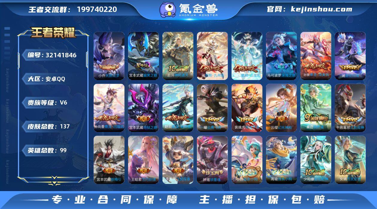【精品推荐·天鹅之梦·龙年全限定·深海之息·惊梅引·愿照众生和·愿照九州拓·祥瑞亨通·逐花归海·云鹰飞将·乞巧织情·可二次】YXw17814-安卓Q-99英雄-137皮肤-5王者印记-126铭文-贵族积分3w【贵族7】【1典藏·1星传说·17传说·12按键】【因赛季更新游戏段付以上号为准!】 【英雄全皮】:孙权全皮,影全皮 【荣耀典藏】:小乔天鹅之梦 【星元皮肤】:宫本武藏幽冥之眼 【传说皮肤】:后羿神树通天,妲己愿照众生和,澜愿照九州拓,云缨幻光神枪,裴擒虎祥瑞亨通,桑启鸣野蒿,孙尚香乘龙问璇玑,孙策乘龙淬吴钩,赵云乘龙铭钟鼎,澜逐花归海,宫本武藏惊梅引,马可波罗深海之息,王昭君乞巧织情,李元芳飞鸢探春,曜云鹰飞将,干将莫邪久胜战神,宫本武藏地狱之眼 【限定皮肤】:蔡文姬夏日便利店,虞姬夏日便利店,姜子牙天穹之誓,李白谪仙醉月,狄仁杰阴阳师,赵云皇家上将,元歌无心,马可波罗深海之息,狄仁杰魔术师,项羽海滩派对,李元芳匿光侦查者,蔡文姬奇迹圣诞,云中君纤云弄巧,鲁班大师探海日志,张良古海寻踪,高渐离燃音魔法,妲己灵卜魔法,鬼谷子天穹祈灯,伽罗琥珀纪元,大乔乘龙忆丹青,安琪拉乘龙聚宝船,孙尚香乘龙问璇玑,孙策乘龙淬吴钩,赵云乘龙铭钟鼎 【年限皮肤】:孙尚香乘龙问璇玑,孙策乘龙淬吴钩,赵云乘龙铭钟鼎,大乔乘龙忆丹青,安琪拉乘龙聚宝船,妲己愿照众生和,澜愿照九州拓 【赛季限定】:鲁班大师探海日志,张良古海寻踪,鬼谷子天穹祈灯,姜子牙天穹之誓,东皇太一噬灭天穹,太乙真人谧流熔炉,甄姬逆浪荇歌,亚瑟荣光之誓 【战令限定】:高渐离燃音魔法,妲己灵卜魔法,蔡文姬夏日便利店,虞姬夏日便利店,孙膑茶境仙,马超访茗客,周瑜百相守梦,孙策百相守梦,兰陵王傩神司,莱西奥光弋星穹,明世隐往忆晖光,周瑜线条小狗,小乔线条小狗 【史诗皮肤】:钟馗锁墨魂,周瑜线...