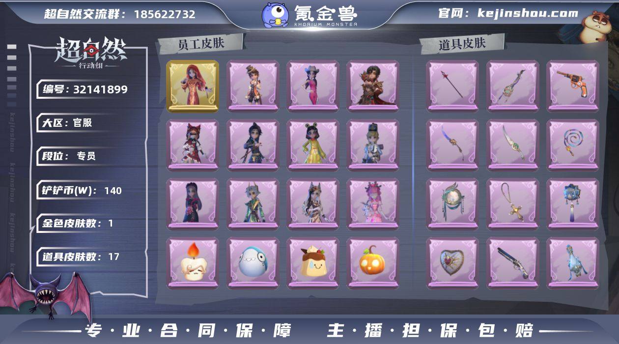 金皮1;紫皮11;道具皮17;皮肤:巫铃儿-镜花辞,零-搬开山,莉莉-莓果陷阱,爱丽丝-耀眼的你,阿念-王子与骑士,薇薇安-白光莹,莉莉-情公主,阿念-庆宴绮愿,逍遥-泽引山海,小黄-呱呱雨衣,爱丽丝-丝缕哀歌,逍遥-绣春逍影;道具:音响-happy猫,刺刀-紫气东来,额外的背包-飞花令,急救包-蔷薇物语,音响-鸣沙鼓,长鞭-飞天绫,腰包-月下莲台,除颤仪-弦外之音,刺刀-碧络琅环,长枪-罪棘,转轮手枪-新星时代,腰包-宝剑八,传送按钮-昆仑镜,黄牛能量饮料-青玉抱丹,摸金符-祝祷词,短管猎枪-星光的裁决,伞-伞;饰品:头饰-樱桃奶油布丁,头饰-太空鲨头套,头饰-嘻嘻头套,头饰-驼半仙头套,头饰-炙热烧烤,头饰-面具马头套,头饰-哈士奇头套,头饰-蒜了八,头饰-惊魂南瓜头套,头饰-大葱明头套,头饰-萨卡班甲鱼头套,头饰-马上有钱,头饰-火爆了头套,头饰-呆滞头套,头饰-鱼头怪头套,头饰-卑微头套,头饰-精致露比头套,头饰-小财神豚豚头套,头饰-鳄霸天头套,头饰-烈焰红唇头套,头饰-滑稽头套,头饰-烛光纪念,头饰-像素朋克墨镜,头饰-哞哞牛头套,头饰-后室幸存者头套,挂饰-九色祥鹿,挂饰-钗头凤,挂饰-天使消失的年代,挂饰-小鲨包包,背饰-天使的呼唤,背饰-云梦之星,背饰-牛啤背包;动作:动作-新年摇,动作-鹏友摇,动作-luvaboy,动作-鸳鸯戏,动作-姬芽摇,动作-七仔摇,动作-舞台中心,动作-律动迪斯科,动作-拜年,动作-要糖,动作-举牌,动作-KT猫摇,动作-带你逃跑吧,动作-抬手;工牌背景:工牌背景-卷珠帘,工牌背景-花蕾城堡,工牌背景-永夜巡礼,工牌背景-心同野鹤,工牌背景-复活的肖像,工牌背景-情语塔;工牌动作:工牌动作-虔诚之姿,工牌动作-元气剪刀手,工牌动作-净禅;员工:薇薇安,员工-阿念,员工-临云,员工-零,员工-莉莉,员工-兰,员工-爱丽丝,员工-巫铃儿,员工-逍遥,员工-小满,员工-爱德华,员工-小黄,员工-艾伦;累充958元;铲铲币14.0万;金砖0;段位...
