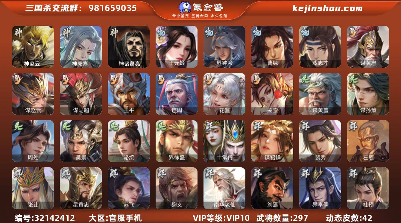 【859】官阶:骠骑将军;VIP等级:VIP10;史诗武将数量:35;动态皮肤数量:42;武将总数:297;史诗宝珠数量:0;将魂数量:497;神将:5;魏国史诗武将:13;蜀国史诗武将:7;吴国史诗武将:6;群史诗武将:15 神赵云,神郭嘉,神吕蒙,神周瑜,神诸葛亮,王元姬,界钟会,曹纯,戏志才,关索,谋黄忠,谋赵云,谋马超,王平,谯周,花鬘,谋黄盖,谋孙策,周处,吴景,骆统,界徐盛,十常侍,谋貂蝉,裴秀,左慈,张让,星黄忠,苏飞,麹义,南华老仙,刘焉,界李儒,杜预,卑弥呼,鲍信,张绣,神郭嘉-倚星折月(动态),神诸葛亮-孟章诛邪(动态),郭嘉-以身证道(动态),钟会-潜蛟觊天(动态),曹丕-气荡山河(动态),甄姬-明珠耀躯(动态),SP蔡文姬-兔年冬日(动态),许褚-兔年端午(动态),邓艾-神兵天降(动态),关羽-明良千古(动态),马超-虎年冬至(动态),马超-明良千古(动态),张飞-据水断桥(动态),界张飞-据水断桥(动态),关索-虎年七夕(动态),鲍三娘-虎年七夕(动态),小乔-兔年七夕(动态),太史慈-涤荡江东(动态),周处-义除三害(动态),吕蒙-剑起惊澜(动态),孙权-永开吴祚(动态),周瑜-兔年七夕(动态),大乔-猪年七夕(动态),孙策-猪年七夕(动态),界大乔-猪年七夕(动态),徐盛-破军杀将(动态),貂蝉-舞惑群心(动态),卑弥呼-呼风唤雨(动态),杜预-龙吟破竹(动态),貂蝉-鼠年七夕(动态),界貂蝉-鼠年七夕(动态),刘焉-雄踞益州(动态)