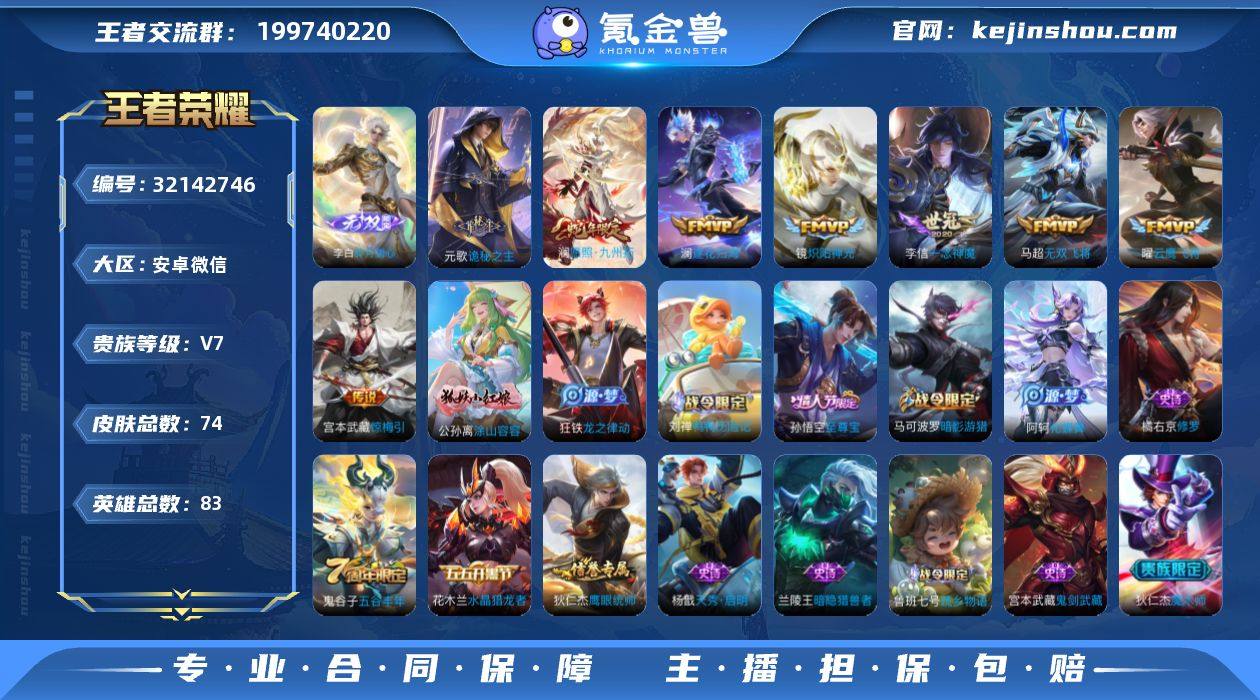 【精品打野小号·碎月剑心·诡秘之主·澜愿照九州拓·澜逐花归海·惊梅引·无双飞将·镜炽阳神光·曜云鹰飞将·一念神魔·至尊宝·可二次】YXw14777-安卓WX-83英雄-74皮肤-2王者印记-60铭文-贵族积分2w【贵族7】【·1无双·8传说·13按键】【因赛季更新游戏段付以上号为准!】 【无双皮肤】:李白碎月剑心 【传说皮肤】:元歌诡秘之主,澜愿照九州拓,澜逐花归海,宫本武藏惊梅引,马超无双飞将,镜炽阳神光,曜云鹰飞将,李信一念神魔 【限定皮肤】:狄仁杰阴阳师,赵云皇家上将,马可波罗暗影游猎,狄仁杰魔术师,项羽海滩派对,孙悟空至尊宝,鬼谷子五谷丰年,李白碎月剑心,鲁班七号蔬乡物语 【年限皮肤】:澜愿照九州拓 【赛季限定】:东皇太一噬灭天穹,太乙真人谧流熔炉,钟馗虚灵犬护,亚瑟荣光之誓 【战令限定】:马可波罗暗影游猎,鲁班七号蔬乡物语,孙膑茶境仙,马超访茗客,刘禅鸭鸭历险记,沈梦溪鸭鸭历险记 【史诗皮肤】:赵云皇家上将,狄仁杰魔术师,宫本武藏鬼剑武藏,嬴政摇滚巨星,妲己魅力维加斯,孙悟空至尊宝,花木兰水晶猎龙者,兰陵王暗隐猎兽者,狄仁杰鹰眼统帅,橘右京修罗,马可波罗暗影游猎,杨戬天秀启明,鬼谷子五谷丰年,鲁班七号蔬乡物语,孙膑茶境仙,阿轲化蝶舞,刘禅鸭鸭历险记,狂铁龙之律动,公孙离涂山容容 【其他皮肤】:项羽海滩派对,韩信教廷特使,韩信街头霸王,阿轲爱心护理,白起白色死神,典韦黄金武士,亚瑟死亡骑士,达摩拳王,刘备万事如意,狄仁杰阴阳师,关羽龙腾万里,诸葛亮掌控之力,李白敏锐之力,大乔守护之力,吕布野性能量,大司命暗都幽影,东皇太一噬灭天穹,太乙真人谧流熔炉,马超访茗客,西施雪境奇遇,戈娅玫蓝誓约,刘备浪漫序章,钟馗虚灵犬护,沈梦溪鸭鸭历险记,苏烈春野闲踪,张良灵野札记,阿古朵布丁狗之约,哪吒罗小黑战记,亚瑟荣光之誓,艾琳鹤鸣心...